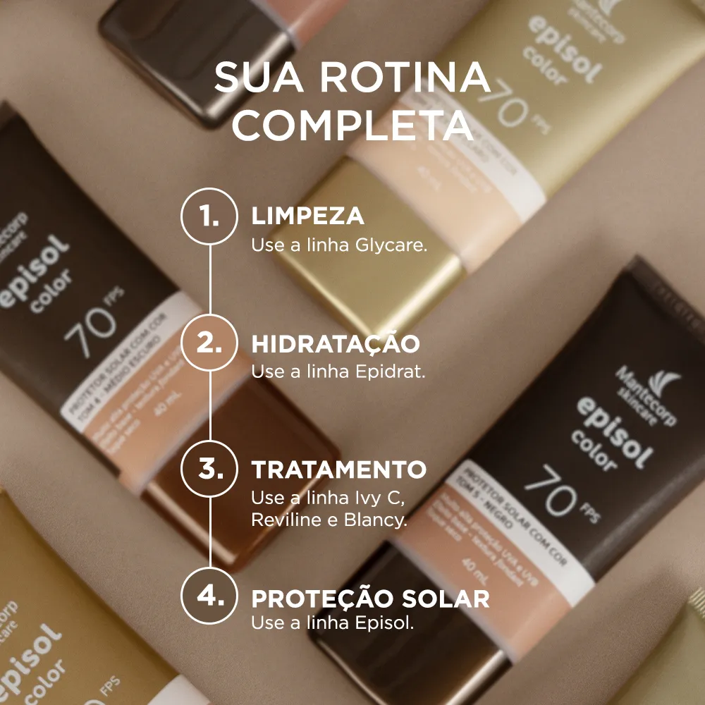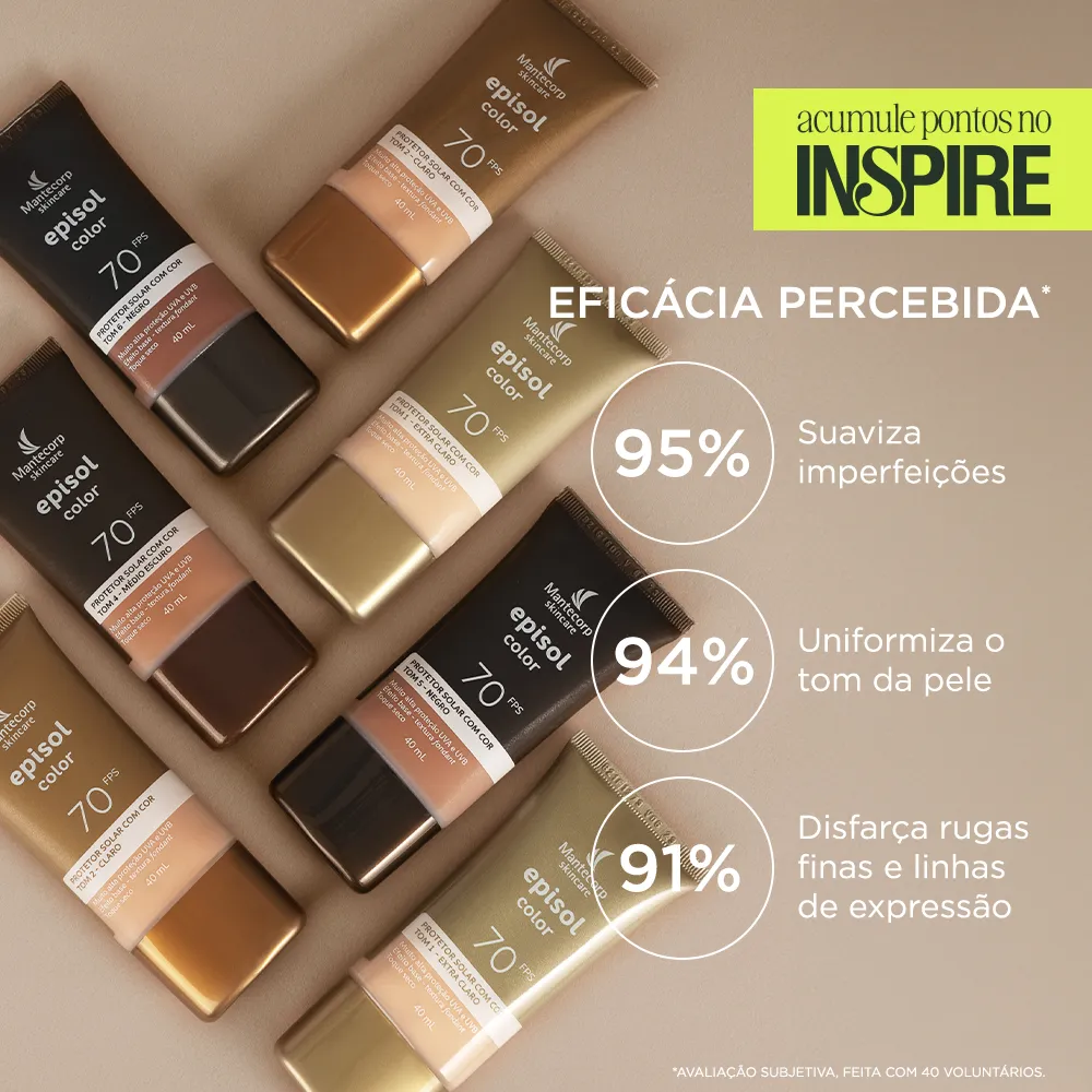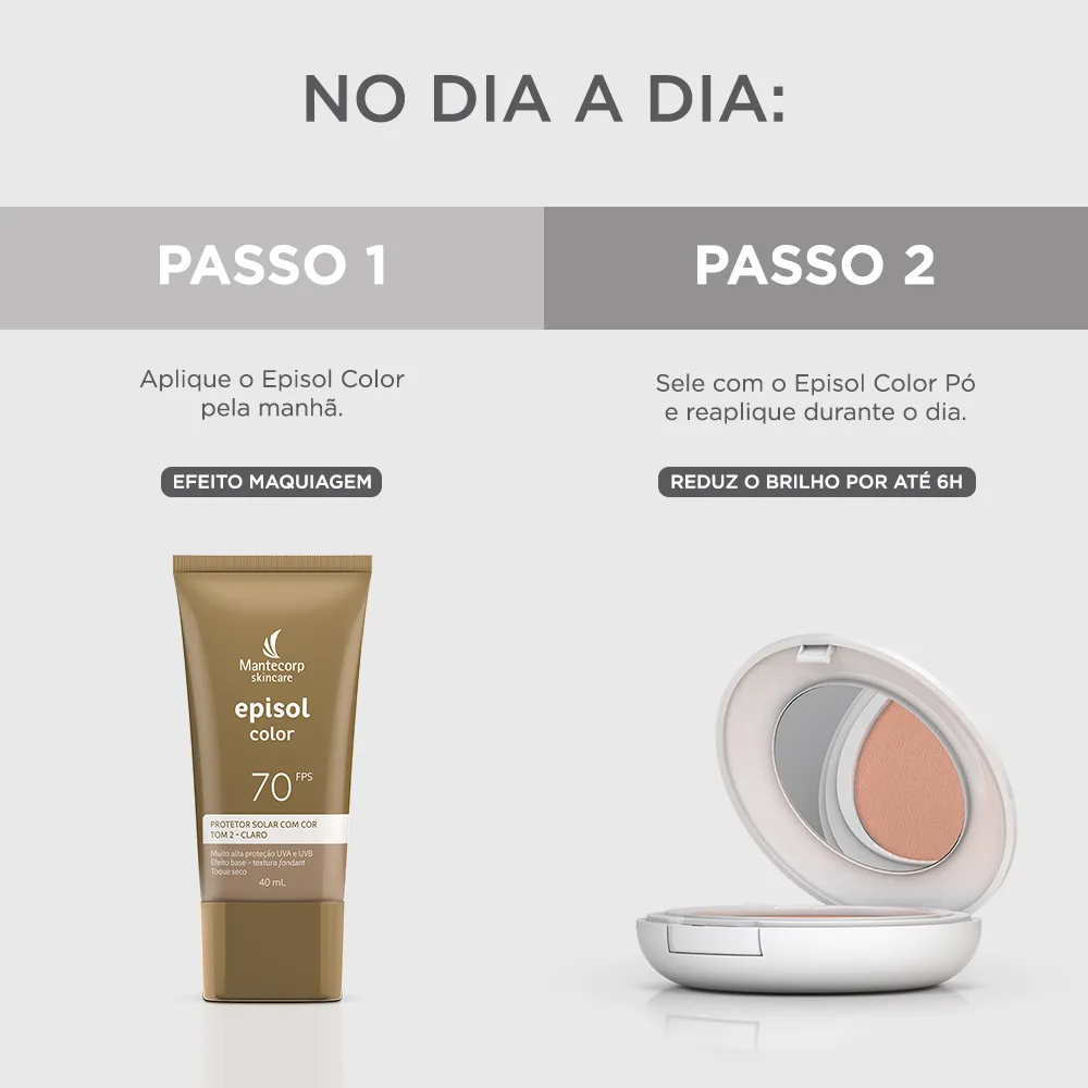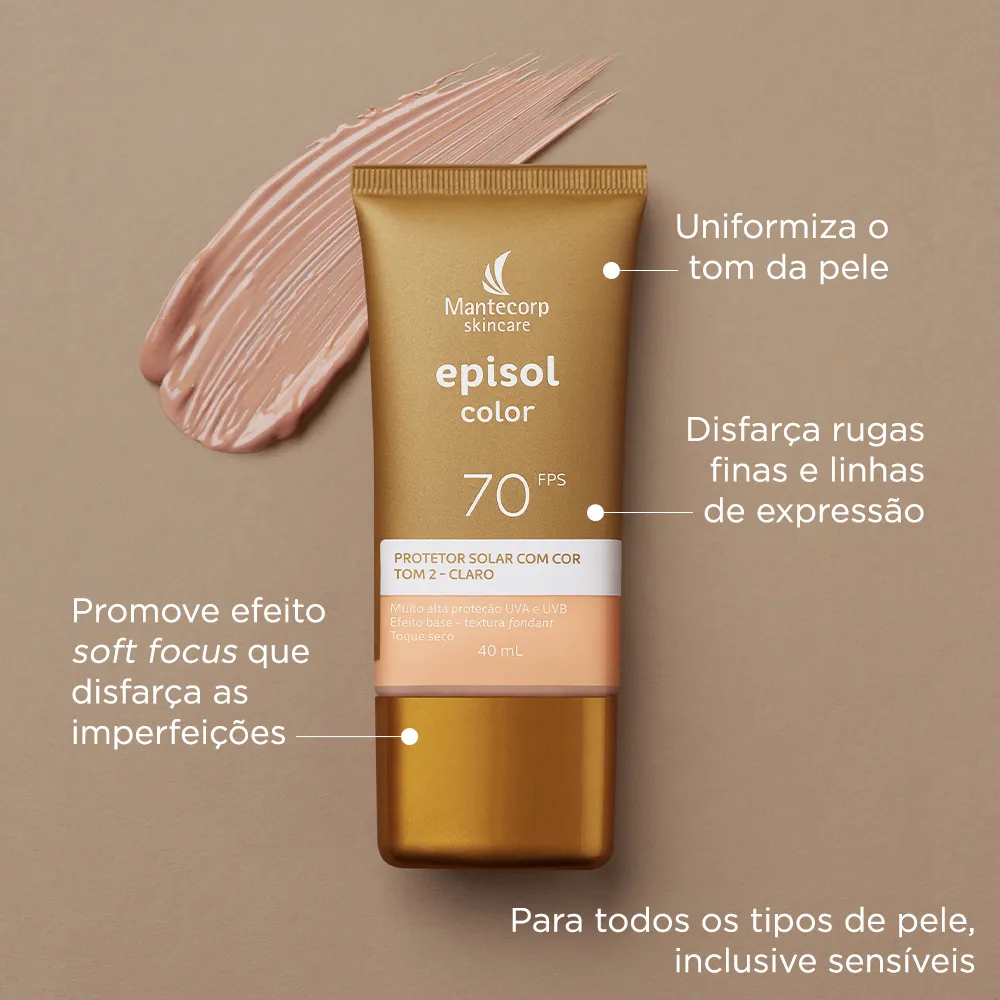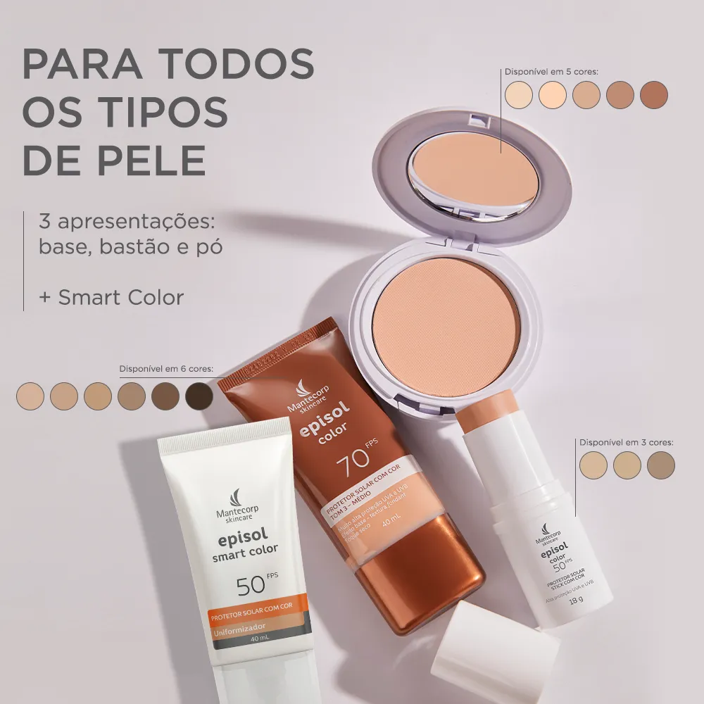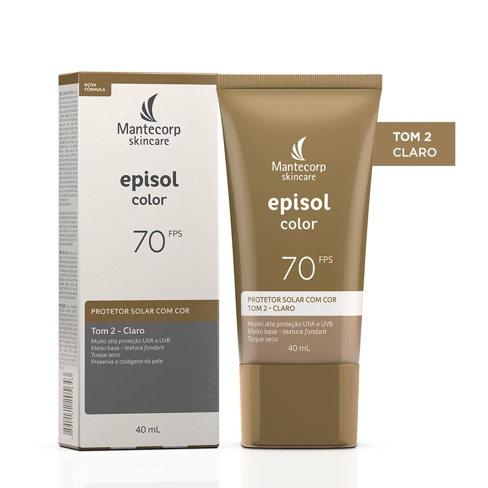 Novo Protetor Solar Facial Episol Color FPS70: nova fórmula sem cheiro de protetor solar com o mesmo nível de proteção e cobertura, novos nomes, novas embalagens e nova cor!Episol Color é uma linha de fotoprotetores com cor que oferece alta proteção contra os raios UVA/UVB, Luz Visível e Infravermelho A e promove cobertura perfeita e uniforme da pele, com efeito natural, matificante e toque seco. Agora Episol Color FPS70 lança mais uma tonalidade e está com novos, sendo assim a linha de protetores com cor mais diversa do mercado. São 6 cores disponíveis: Tom I - Extraclaro (antigo pele extraclara), Tom II – Claro (antigo pele clara), Tom III – médio (antigo pele morena), Tom IV- médio escuro (antigo pele morena mais), Tom V – negro (antigo pele negra) e o NOVO Tom VI – Negro.