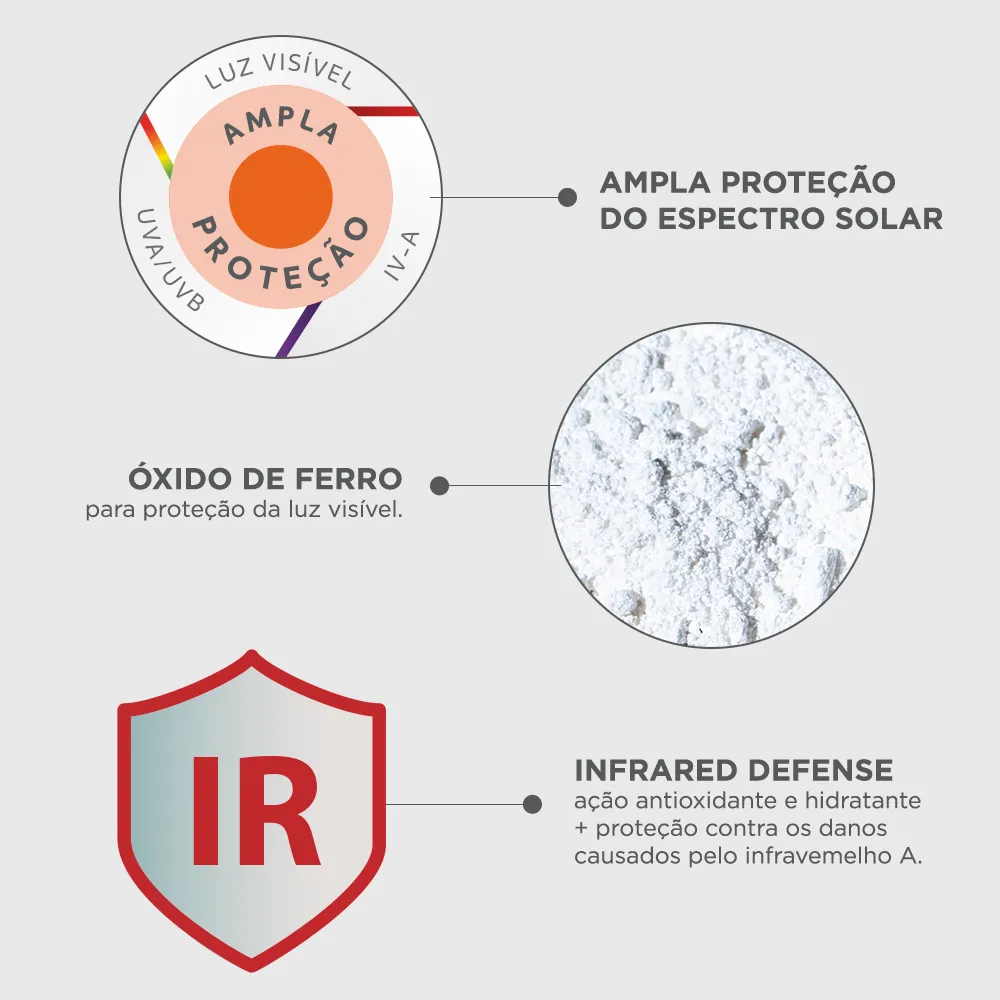 • Alta e muito proteção UVA, UVB, luz visível e Infravermelho A