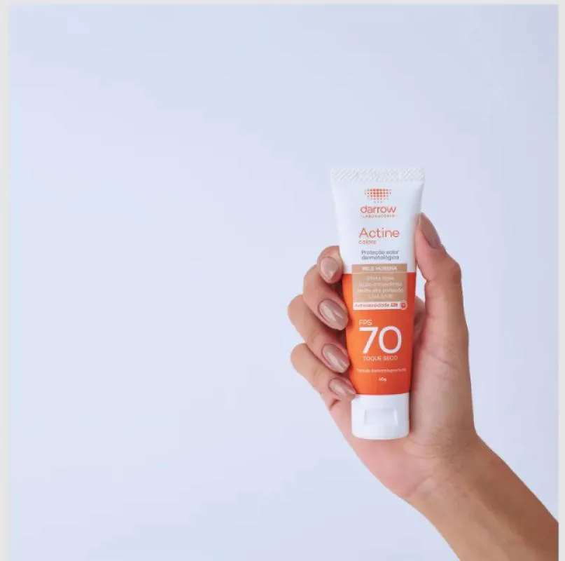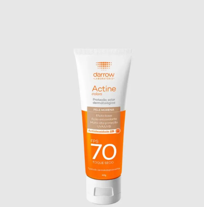 Favor selecionar a variação da cor no anúncio! Darrow Actine Colors FPS70 Toque Seco Filtro solar facial com cor. Darrow Actine Colors FPS70 conta com toque seco e efeito uniformizador: ideal para peles oleosas e acneicas. Protetor Solar Darrow Actine Colors FPS70 possui ação antioxidante e garante alta proteção contra os raios UVA e UVB. O produto faz parte do segmento Actine: a linha mais prescrita pelos dermatologistas brasileiros e expert em oferecer o melhor tratamento antioleosidade e antiacne. Apresenta fórmula com ativos seborreguladores, como vitamina e e Sílica, além de pigmentos minerais, que previnem contra os efeitos da luz visível e minimizam os danos causados pelos raios infravermelhos. Ideal para manter sua pele livre de manchas, acne, brilho excessivo e envelhecimento precoce. Actine é a linha Nº1 em prescrição dermatológica para peles oleosas. Fórmula hipoalergênica, livre de parabenos, perfume e não testada em animais. Como Usar Conselho de Aplicação Aplique uma boa camada do protetor solar em todo o rosto. Espalhe com movimentos de dentro para fora. Não esqueça das orelhas, pescoço e colo. Nossos Experts Ensinam Passe o protetor solar diariamente pela manhã ou, no mínimo, 15 minutos antes da exposição ao sol. É necessária a reaplicação do produto para manter a sua efetividade, a cada 2 horas. Ação / Resultado Vitamina E e Sílica: ativos que, além da foto proteção, ajudam a prevenir a acne, com um potente controle de oleosidade por até 12 horas. Sua pele protegida, com toque seco por até 12h e com a tonalidade uniformizada