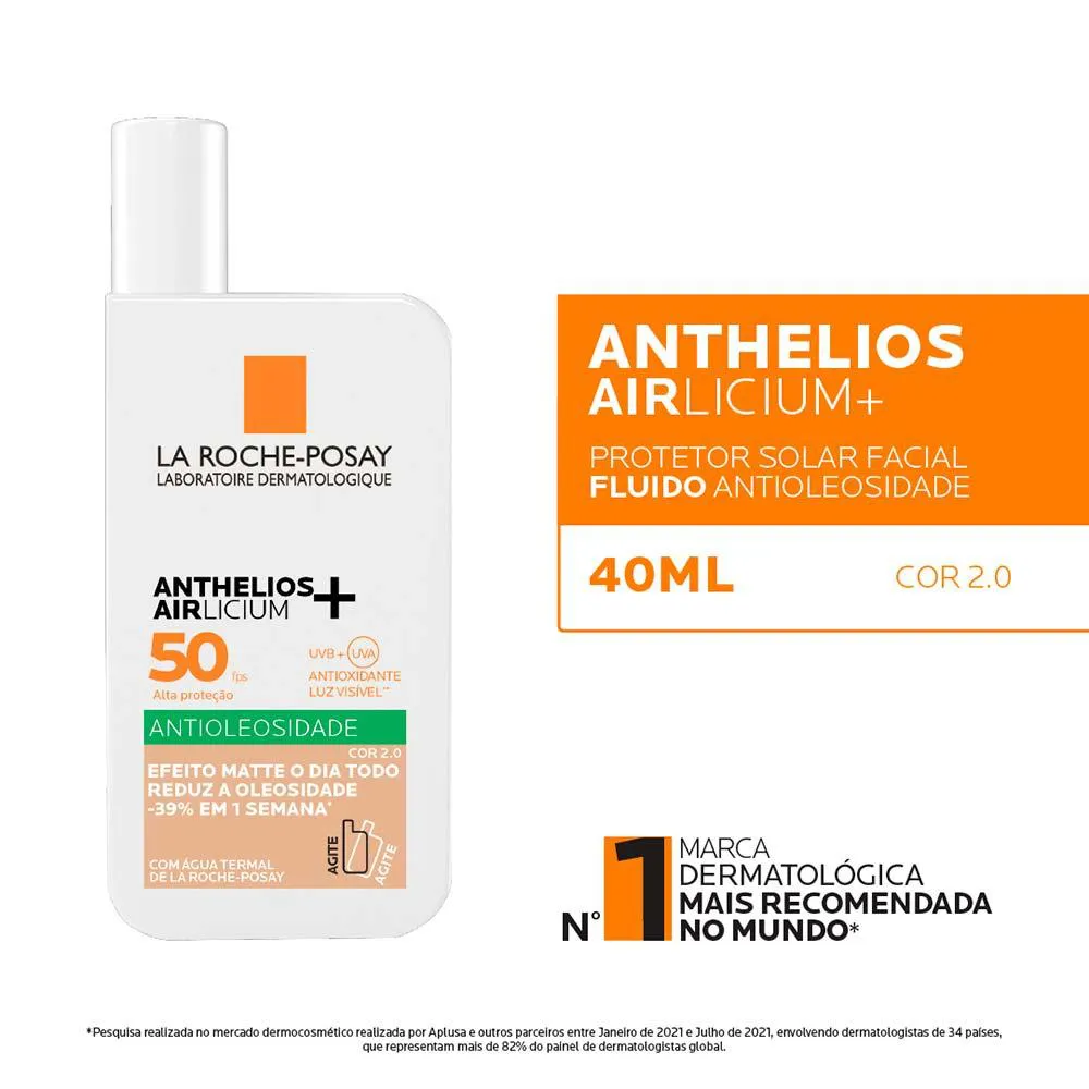O Protetor Solar Anthelios Airlicium+ Fluido Fps 50 Com Cor, de La Roche-Posay, oferece mais do que controle, mas uma redução comprovada de -60% da oleosidade da pele em 4 semanas de uso! Possui toque seco, rápida absorção e espalhabilidade, cobertura natural e uniforme.