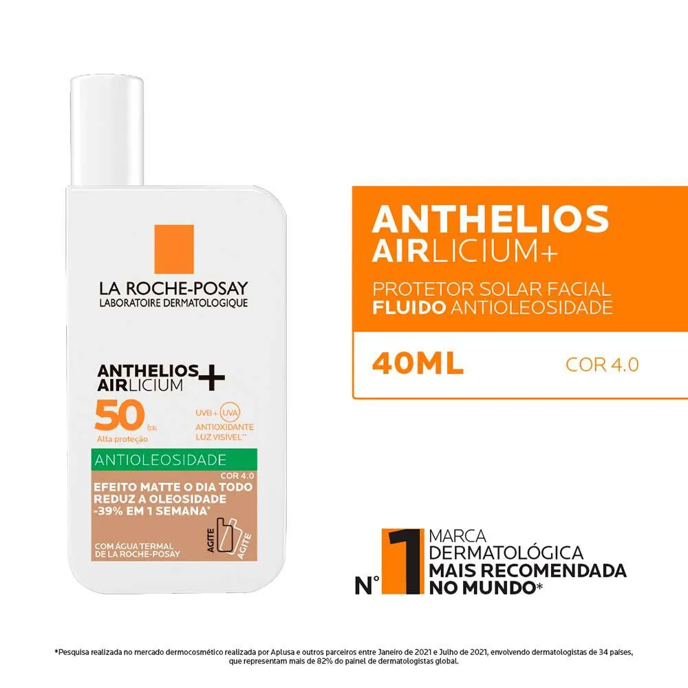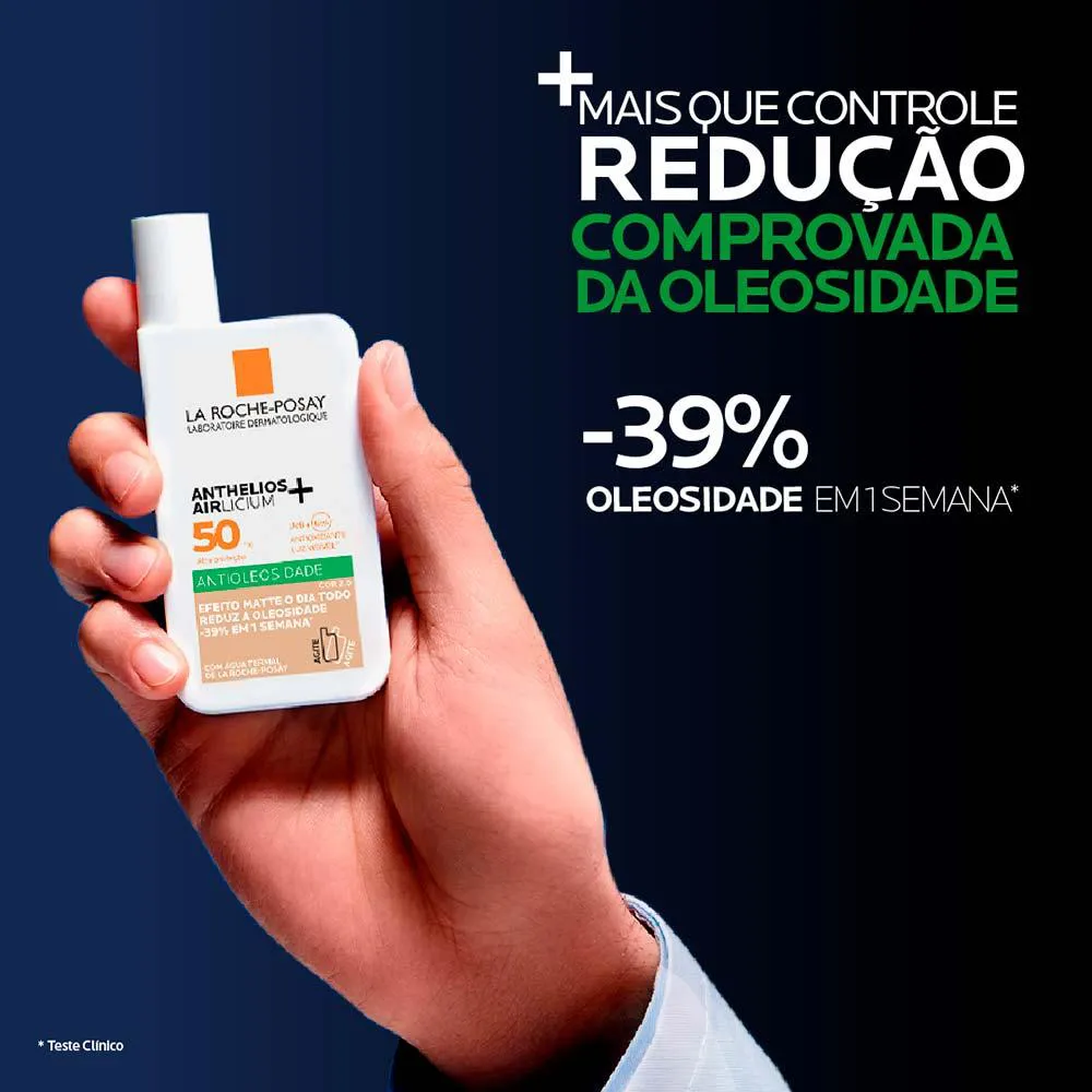 O Protetor Solar Anthelios Airlicium+ Fluido Fps 50 Com Cor, de La Roche-Posay, oferece mais do que controle, mas uma redução comprovada de -60% da oleosidade da pele em 4 semanas de uso! Possui toque seco, rápida absorção e espalhabilidade, cobertura natural e uniforme.