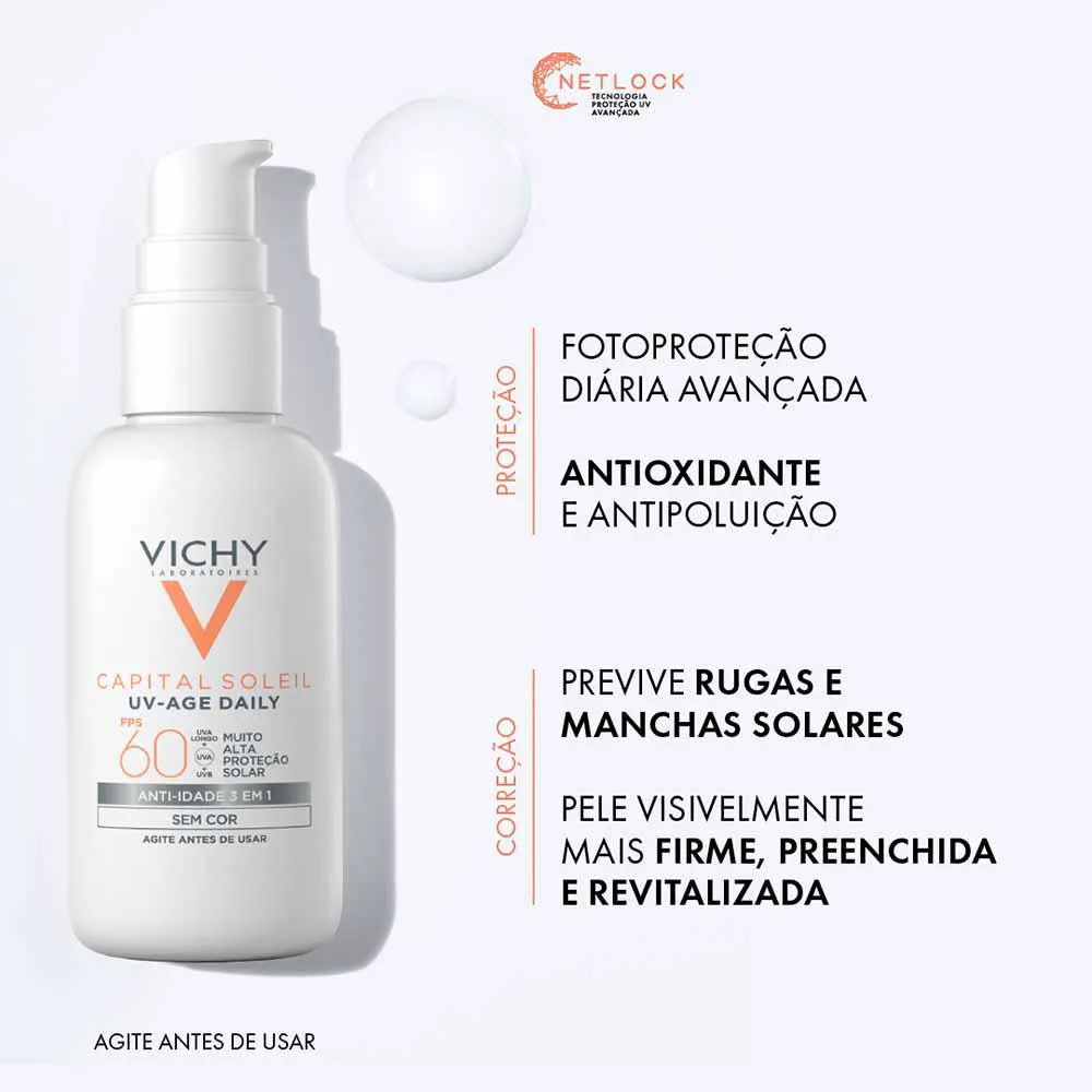 O Protetor Solar Facial com Cor Vichy Capital Soleil UV-Age Daily FPS60 é um avançado protetor solar facial desenvolvido especialmente para atender às necessidades da pele brasileira. Este produto é um aliado poderoso contra os efeitos nocivos do sol, oferecendo proteção solar diária anti-idade 3 em 1: protege contra raios UVA e UVB, previne o desenvolvimento de rugas e manchas solares, além de melhorar a firmeza e revitalização da pele.