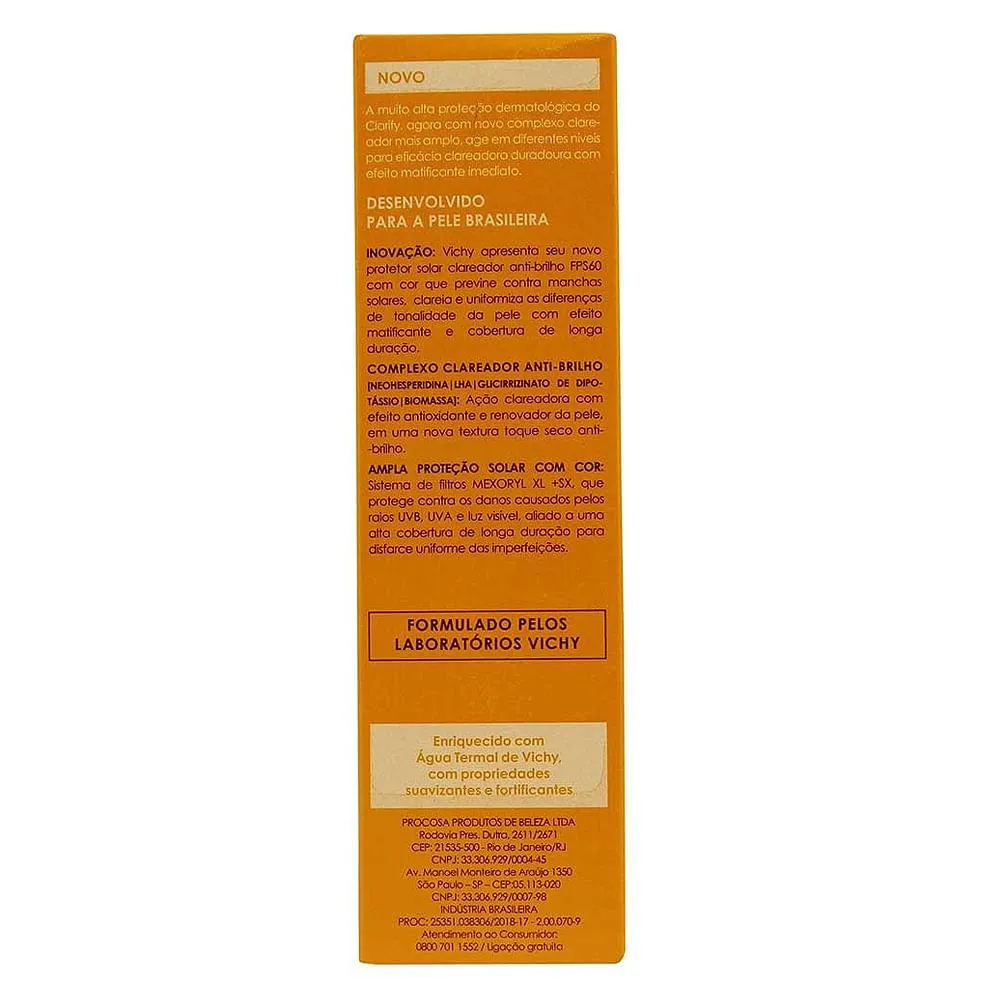 Protetor Solar Facial com Cor base FPS 60 Ação Clareadora de Manchas Proteção UVA UVB Luz Visível Vichy Idéal Soleil Clarify