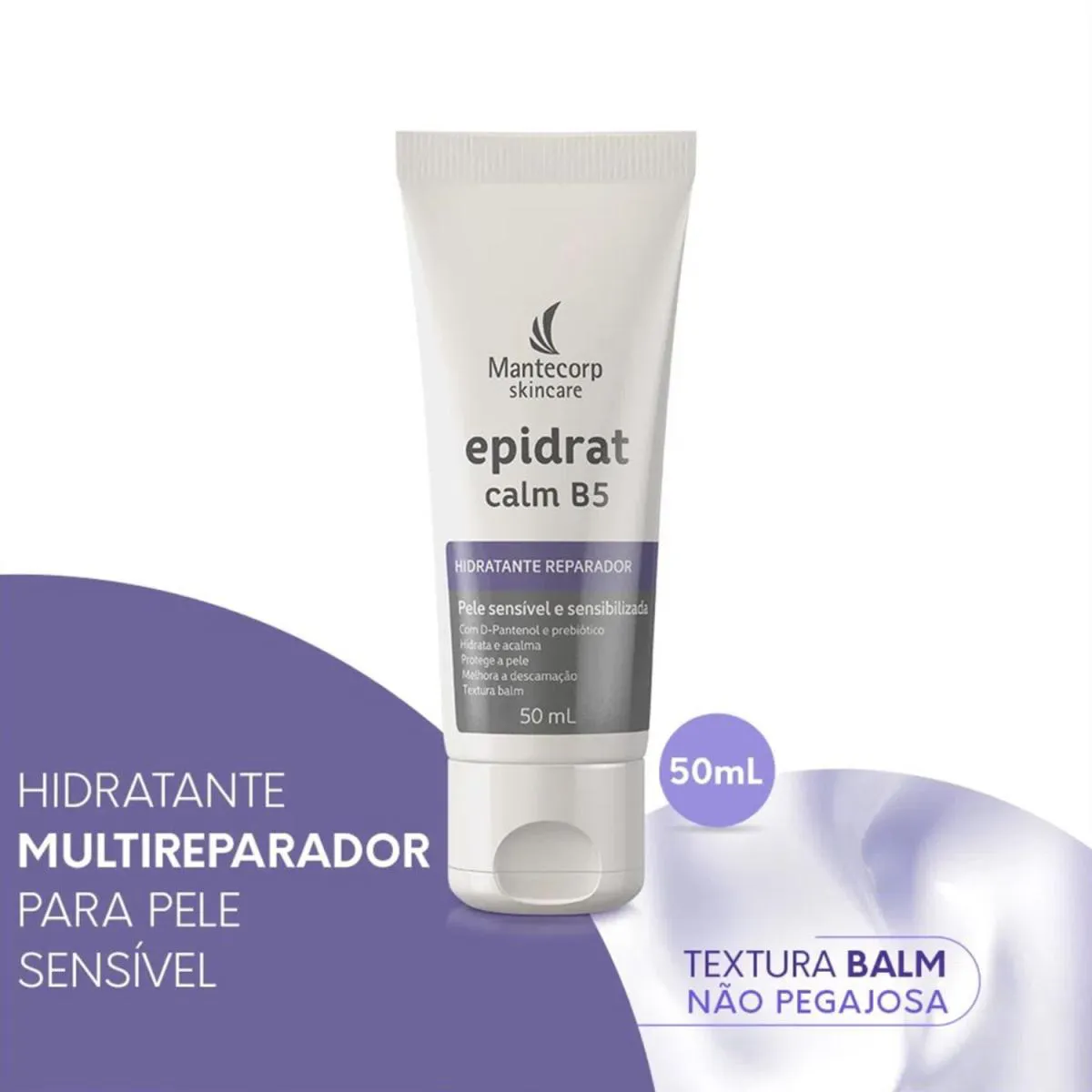 O Epidrat Calm B5 FPS 50 da Mantecorp Skincare é um protetor solar hidratante desenvolvido especialmente para a pele sensível e sensibilizada. Sua fórmula exclusiva conta com Panthenol (Pró-vitamina B5) e Prebiótico, ativos que proporcionam hidratação profunda, ação calmante e ajudam na recuperação da barreira cutânea, deixando a pele mais protegida e saudável. Com alta proteção UVA e UVB (FPS 50), o produto protege eficazmente contra os danos causados pela exposição solar, prevenindo queimaduras, manchas e o envelhecimento precoce da pele.