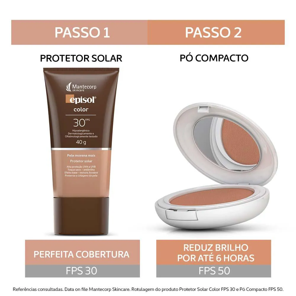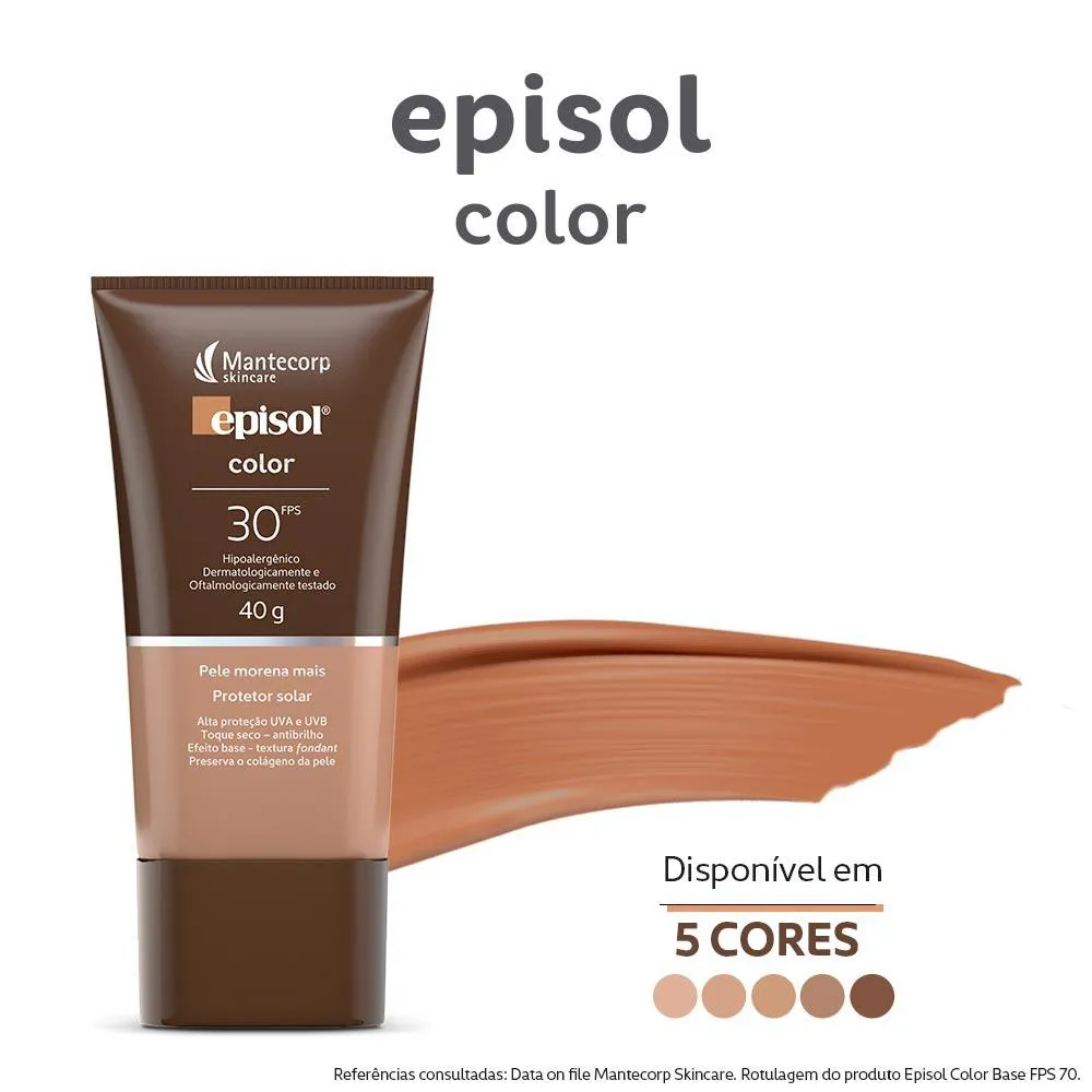Episol Color é uma linha de proteção solar com cor que promove cobertura perfeita e uniforme da pele, com efeito matte e toque seco. Este produto possui inovador sistema de dispersão de pigmentos, não obstrui os poros e previne o envelhecimento precoce, com alta proteção. Está disponível em cinco tonalidades (pele extra clara, pele clara, pele morena, pele morena mais e pele negra).