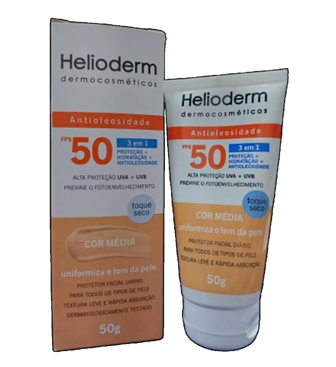 Protetor Solar Facial Fps 50 C/Cor Média 50g - Helioderm Protetor solar facial com cor e alta proteção FPS 50. Fórmula 3 em 1 que uniformiza o tom da pele, controla o brilho e oferece cobertura natural. Textura leve e toque seco, ideal para o uso diário. Imagens Meramente Ilustrativas. Todas as Informações Divulgadas são de Responsabilidade Exclusiva do Fabricante/fornecedor.