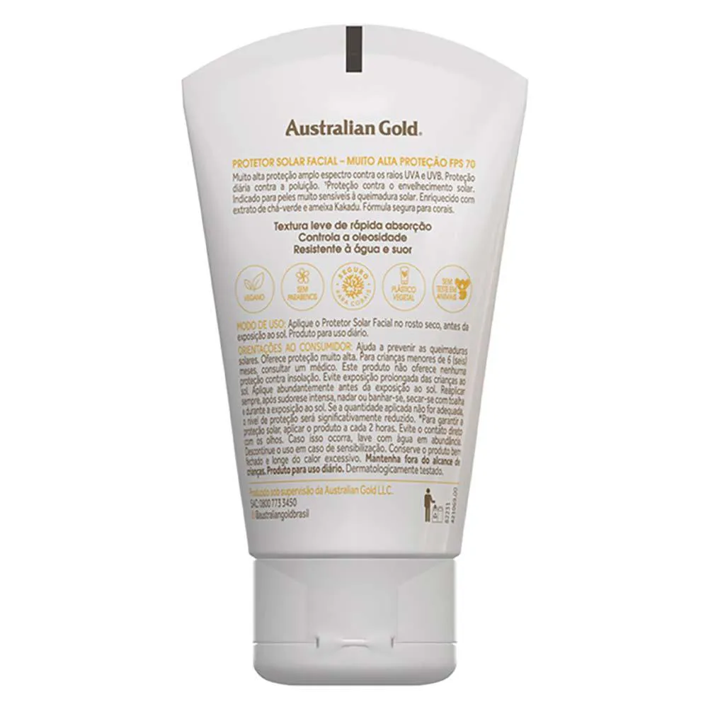 Protetor solar Facial com FPS 70 que protege contra os raios UVA e UVB e os efeitos diários da poluição. Formulado com ameixa de kakadu e extrato de chá verde, possui ativos antienvelhecimento e ação antioxidante. Com textura ultraleve, toque seco e rápida absorção e efeito matte, a linha Gel Creme de Australian Gold é resistente à água para garantir proteção em todos os momentos.