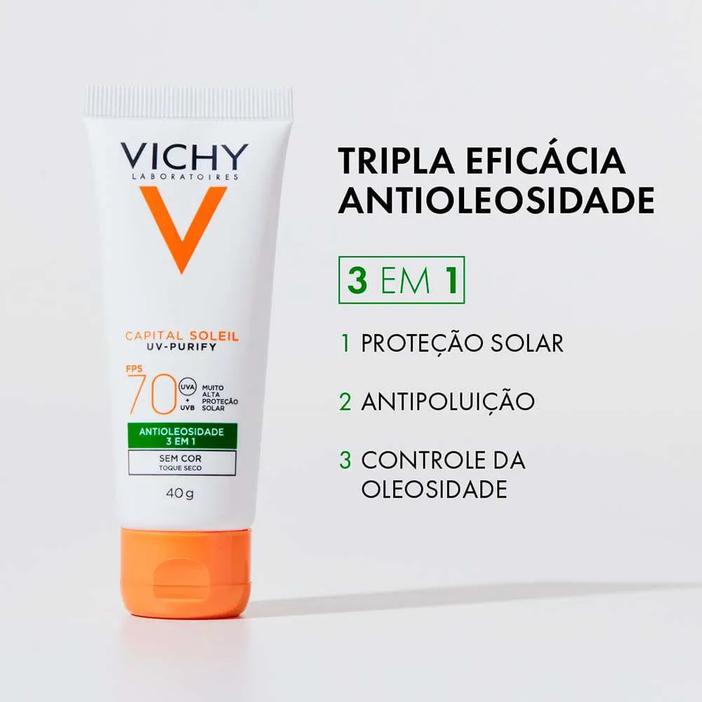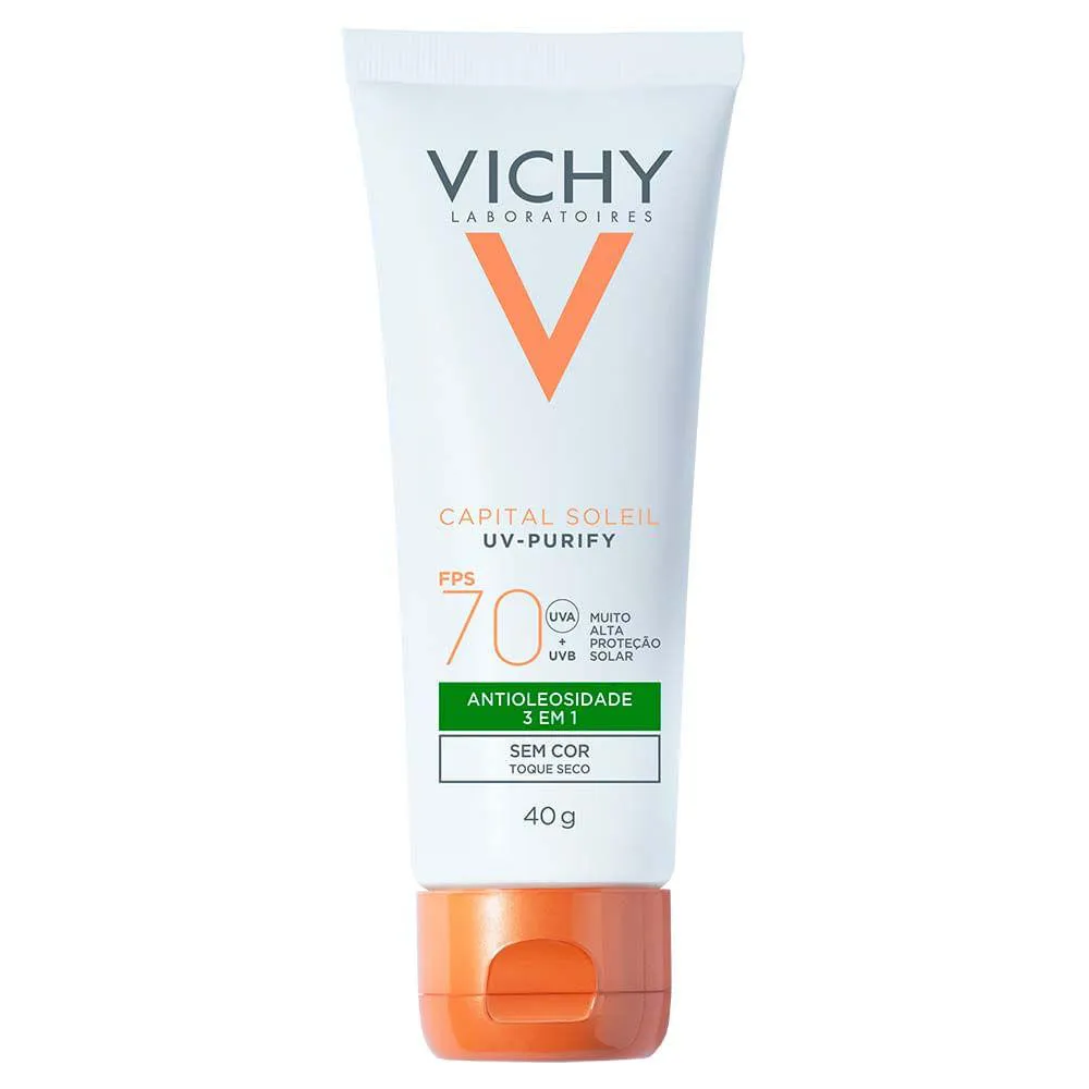 Capital Soleil Uv-Purify 40g de Vichy possui ação antioleosidade e ação purificante, e é indicado para peles oleosas.