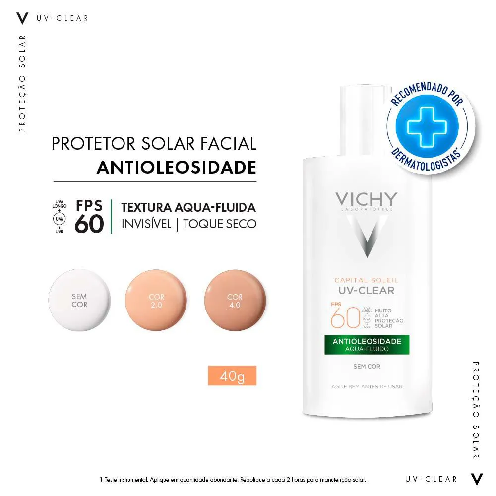 Vichy Capital Soleil UV-Clear FPS 60 é o protetor solar diário para peles oleosas e acneicas. Com Niacinamida e Ácido Salicílico, ele oferece alta proteção, controla a oleosidade por 12h e combate imperfeições, tudo com uma textura aqua-fluida de acabamento invisível.