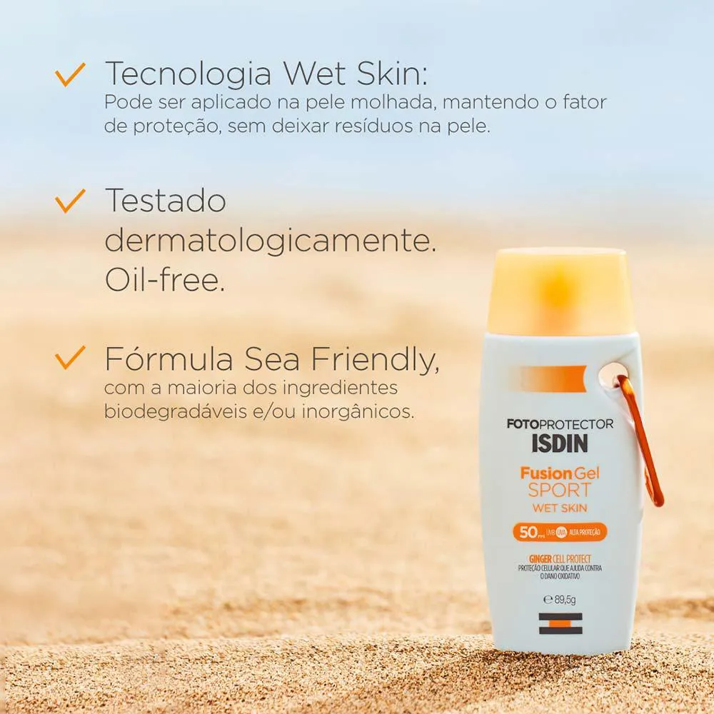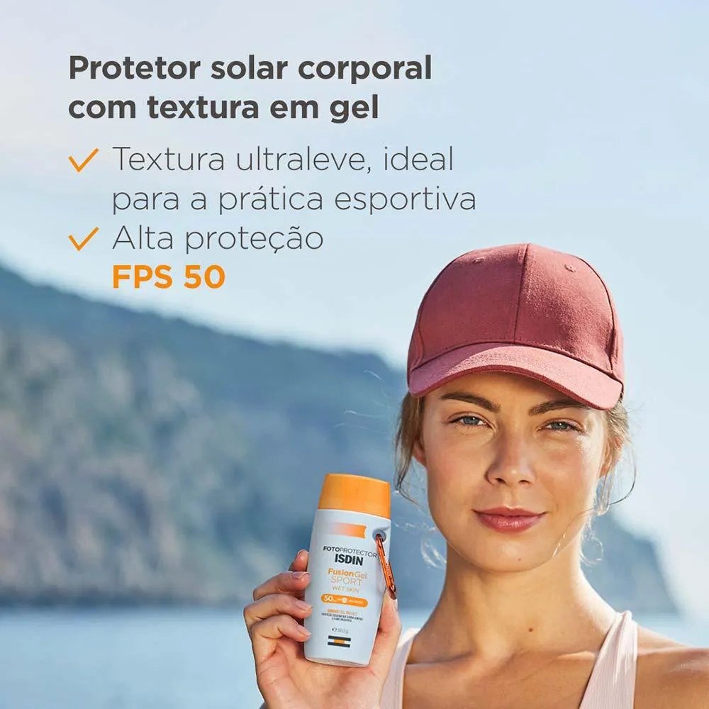 ISDIN Fusion Gel Sport é um protetor solar corporal em gel com textura ultraleve, FPS 50, perfeito para a prática de esportes ao ar livre.