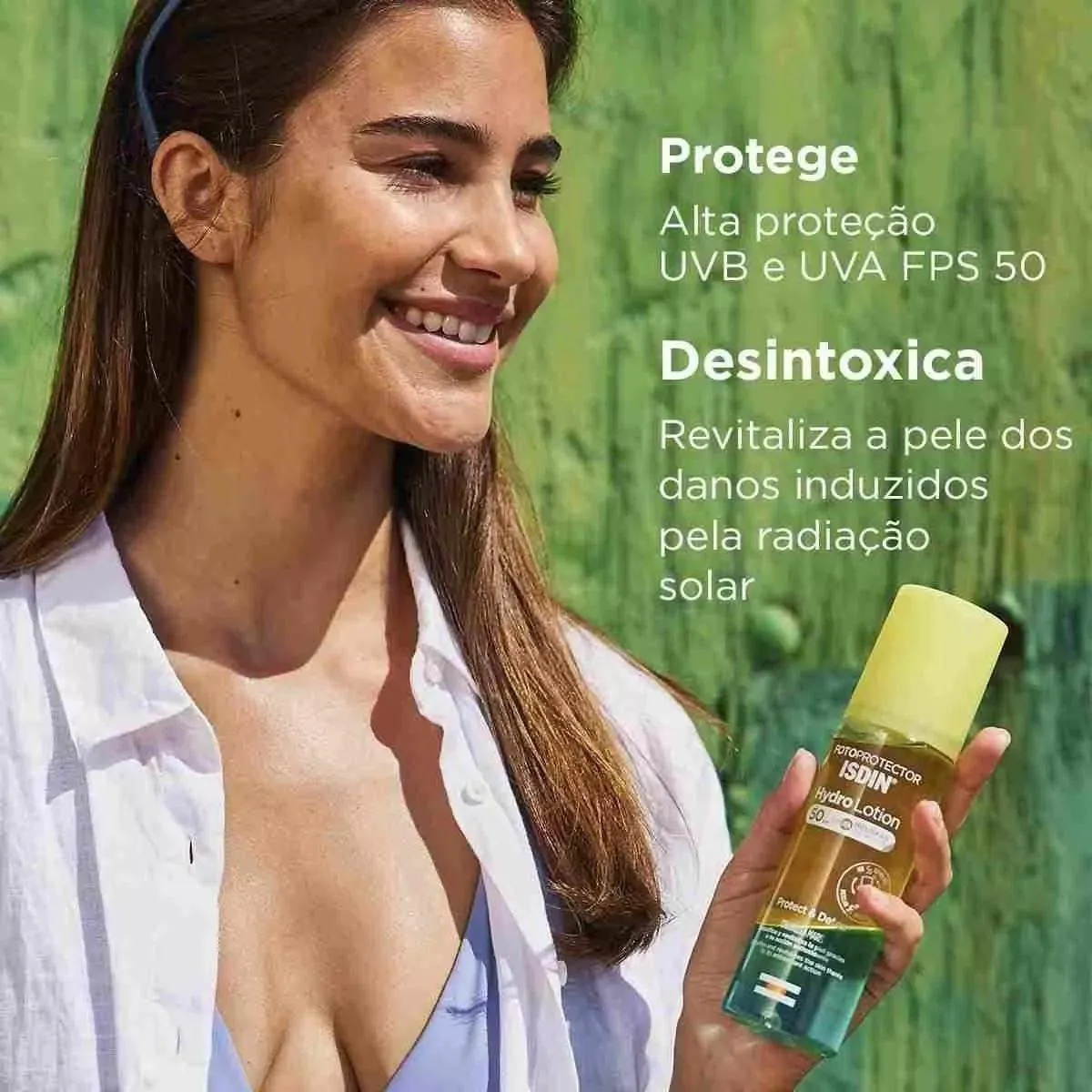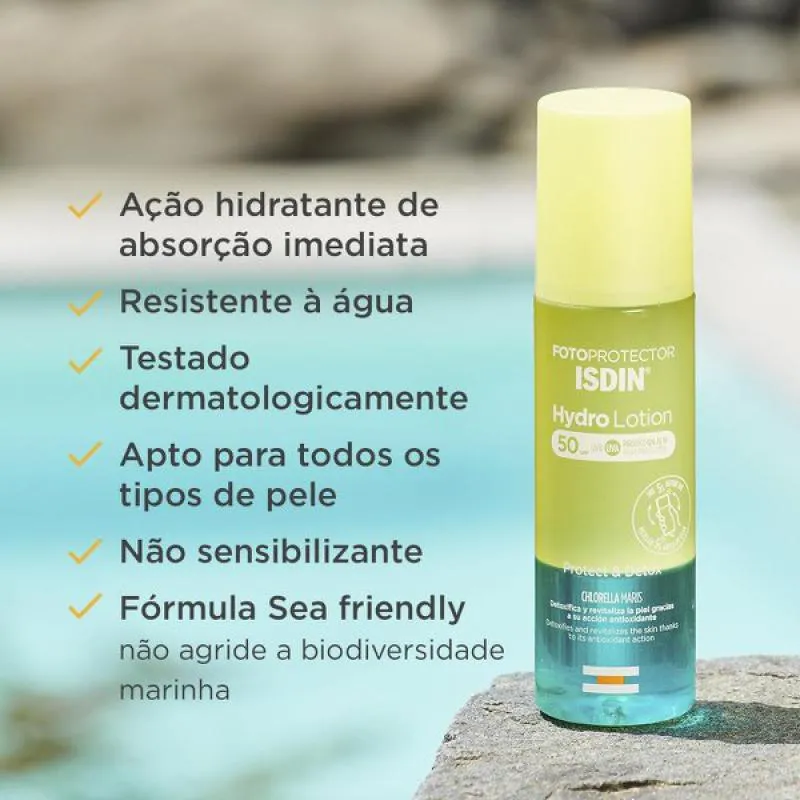 O Protetor Solar Isdin Hydro Lotion é um protetor solar bifásico desenvolvido pela marca ISDIN, com fórmula biodegradável e tecnologia Sepitonic. Sua função principal é proteger a pele contra os raios UVA e UVB, com alta proteção FPS 50, ao mesmo tempo em que oxigena, reenergiza e promove a regeneração celular da pele.