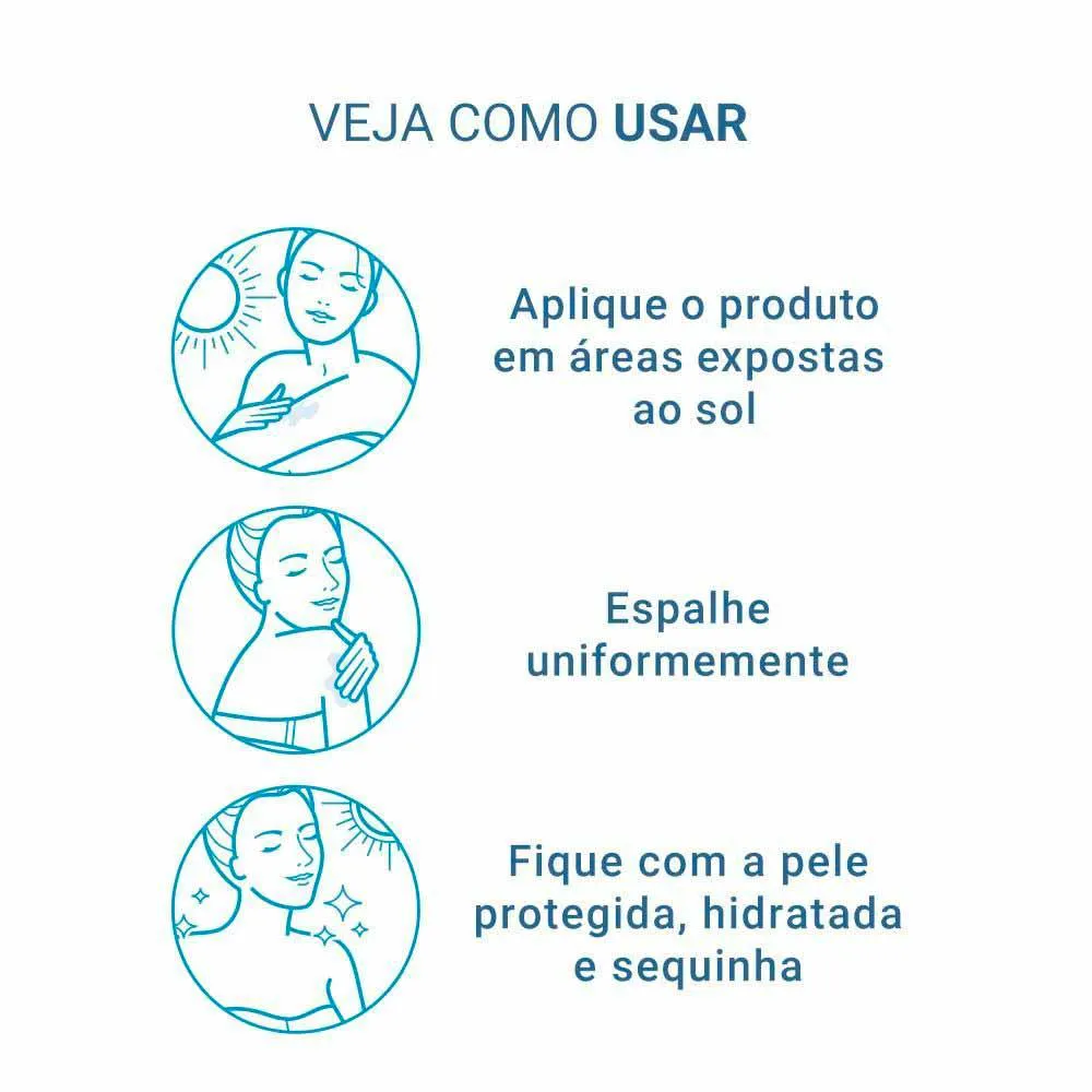 Aplique abundantemente antes da exposição ao sol. É necessária a reaplicação do produto para manter sua efetividade. Reaplicar sempre, após sudorese intensa, nadar ou banhar-se, secar-se com toalha e durante a exposição ao sol. Para fechar, pressione o centro da tampa.
