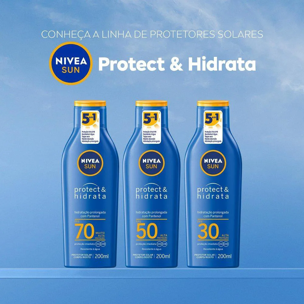 O Protetor Solar Nivea Sun Protect & Hidrata FPS 70 é um produto de proteção solar desenvolvido para defender a pele contra os raios solares. Serve para proteger a pele dos raios UVA e UVB durante a exposição solar, oferecendo alta proteção e hidratação simultânea, com uma fórmula oil-free de rápida absorção que previne o envelhecimento prematuro e mantém a pele saudável.