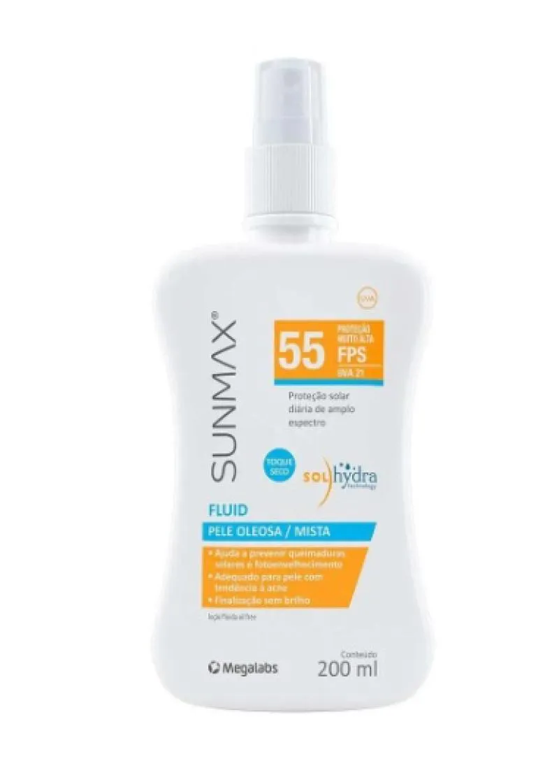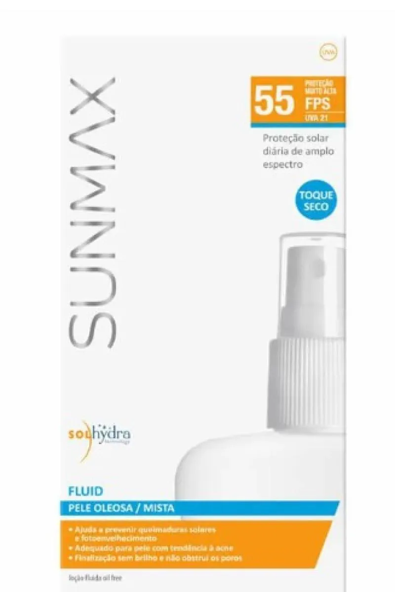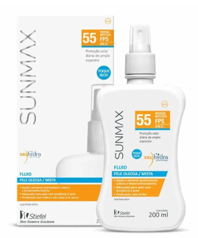 Sunmax Fluid FPS55 é um protetor solar de uso diário que contém filtros de amplo espectro com alta proteção UVB e UVA. É hipoalergênico, sem álcool, corantes, fragância e parabenos.