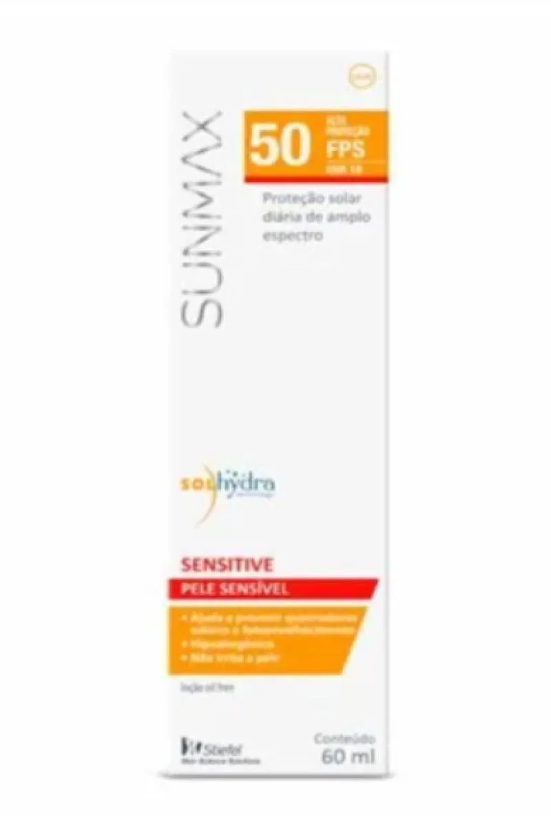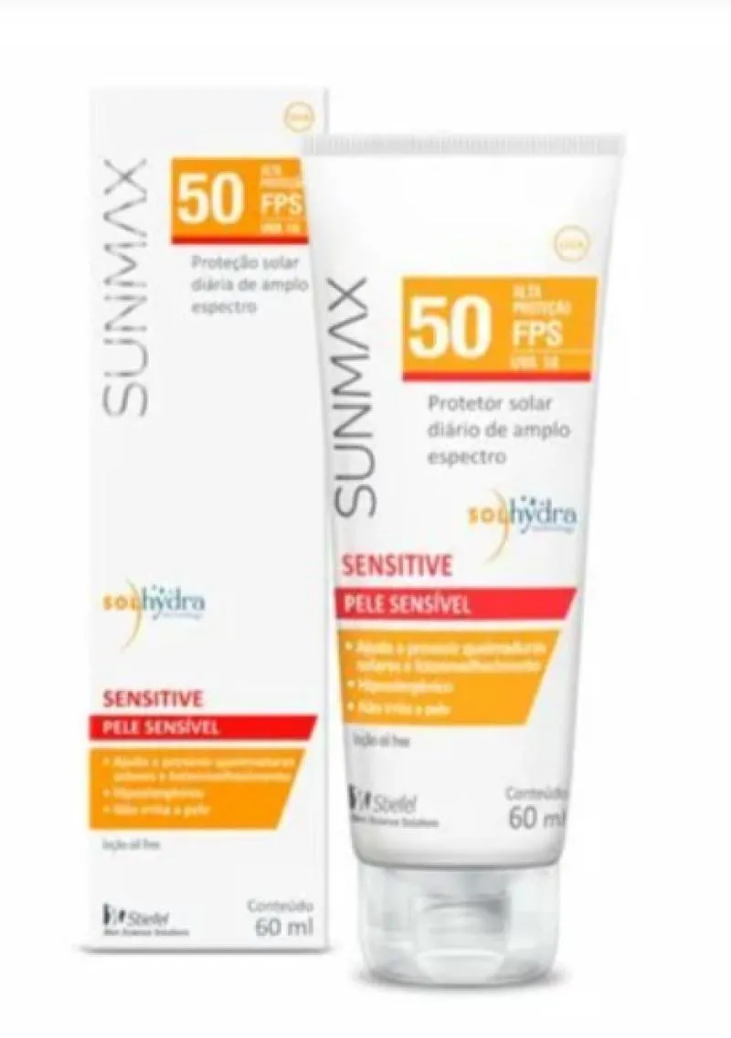 Sensitive FPS50 de Sunmax possui textura leve e finalização matte. É hipolergênico, sem álcool, parabenos ou corante. Não irrita a pele, é livre de álcool, parabeno, corante e fragrância, e é ideal para a pele oleosa e sensível por tratamento. Pode ser usado por crianças a partir de 6 meses. Dermatologicamente testado.