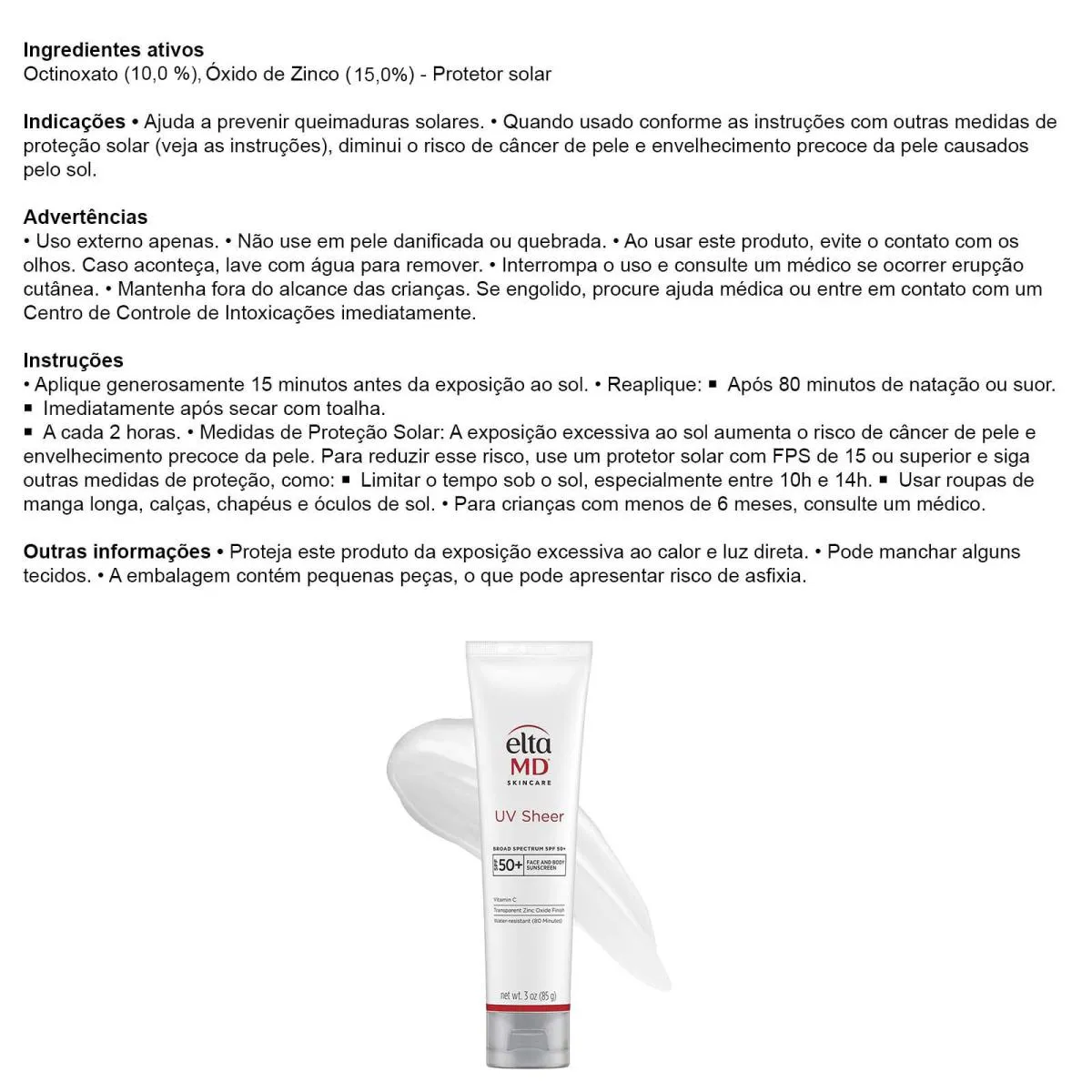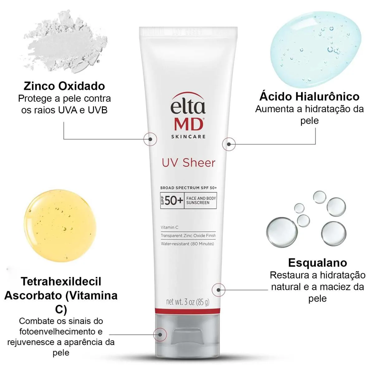 O Protetor Solar EltaMD UV Sheer FPS 50+ é um produto de proteção solar desenvolvido para uso diário no rosto e corpo, com textura leve e acabamento transparente. Serve para proteger a pele contra os raios UVA e UVB, oferecendo amplo espectro de proteção solar, sendo adequado para diferentes tipos de pele e resistente à água por até 80 minutos, ideal para atividades ao ar livre e exposição solar prolongada.