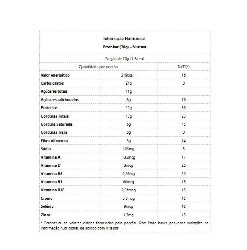 ProtoBar - Nutrata A Protobar é uma barra de proteína composta por diferentes fontes proteicas. Fonte natural de aminoácidos de cadeia ramificada (BCAAs) é rica em proteínas de alto valor biológico e prática, proporcionando uma opção nutritiva e saborosa para as refeições intermediárias ao longo do dia É adicionada da fibra reguladora mais moderna do mercado (Orafti®, Synergy1), 100% natural, de propriedades prebióticas que estimula o trânsito intestinal e modula a flora para manutenção de boa função digestiva e imunológica. Diferenciais de Qualidade:* Adicionado de vitaminas e minerais;* Alto teor proteico cerca de 19g por 70g de produto;* Aporte de fibra prebiótica (Orafti®, Synergy1);* Adicionado de vitamina D3, ação fotoprotetora.