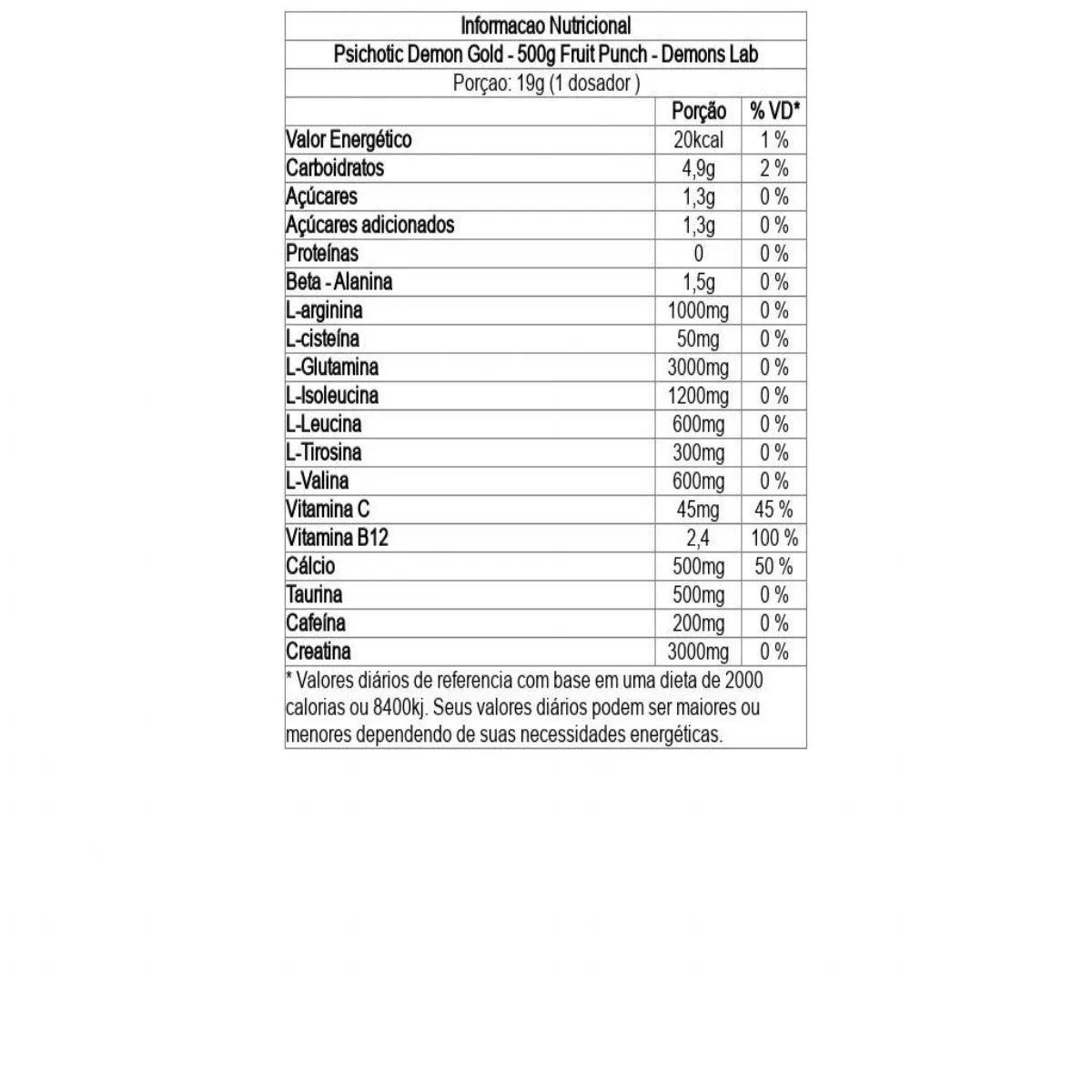 Psichotic Demon Gold (500g) Demons Lab é o pré-treino completo da DEMONS LAB a base de vitaminas, minerais e aminoácidos como a creatina, arginina, alanina, glutamina, entre outros, selecionados para aumentar a resistência, combater a fadiga muscular, aumentar os níveis de óxido nítrico e a vasodilatação, melhorara a distribuição de nutrientes para as células musculares, melhorar a absorção dos aminoácidos, além de aumentar o desempenho físico durante exercícios de repetição de curta duração e alta intensidade.