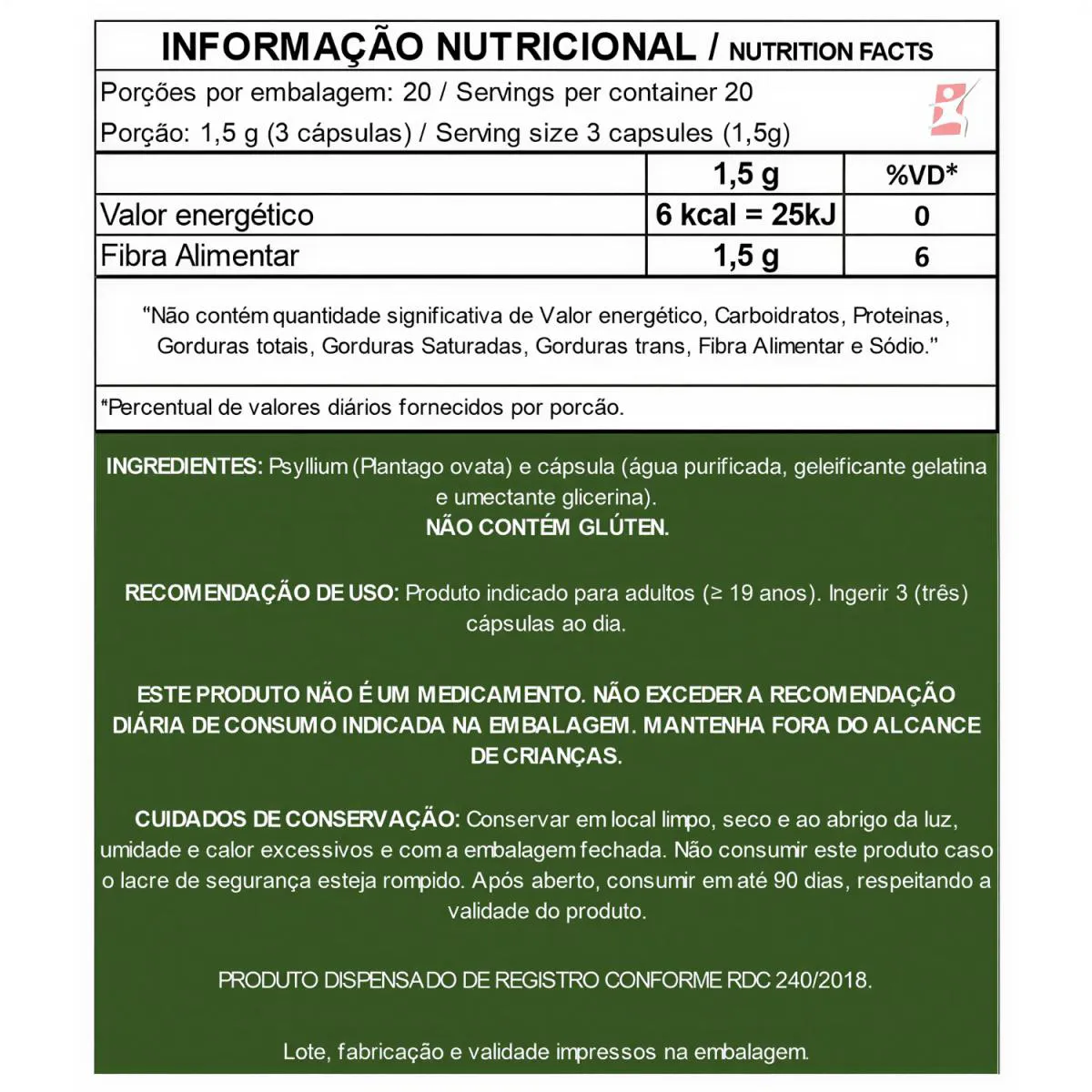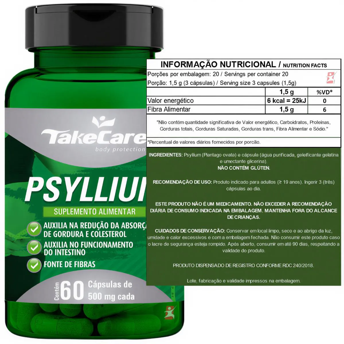 PSYLLIUM PLANTAGO OVATA 500MG saúde DO INTESTINO 60 CÁPSULAS - TAKE CARE DESCRIÇÃO É um suplemento alimentar em cápsulas sendo uma planta que tem como nome científico Plantago ovata, suas sementes e cascas são utilizadas por conter grande quantidade de fibra natural, sendo semelhantes à aveia e ao trigo, possui capacidade de aumentar até 20 vezes de tamanho quando entra em contato com outros líquidos formando-se um gel. BENEFÍCIOS - Pode auxiliar na redução de peso ao promover sensação de saciedade; - Pode auxiliar a diminuir a absorção de gordura das refeições; - Pode auxiliar a diminuir a absorção de colesterol; - Pode auxiliar na melhora do trato gastrointestinal; - SEM GLÚTEN. SUGESTÃO DE USO Produto indicado para adultos ≥ 19 anos. Ingerir 3 (três) cápsulas ao dia, antes das principais refeições. TABELA NUTRICIONAL – COMPOSIÇÃO – RECOMENDAÇÕES Anexo nas imagens. DADOS TÉCNICOS Registro ANVISA – PRODUTO ISENTO DE REGISTRO CONFORME 240/2018. Marca – TAKE CARE. Conteúdo líquido por frasco – 60 cápsulas. Rendimento líquido por frasco – 20 doses/porções. Peso líquido por frasco – 30g. Peso bruto por frasco – 65g. Peso aproximado do produto + embalagem de envio – 150g. Código de barras (EAN) – 7898671431437. Dimensões do produto – altura 11 cm; largura 6 cm; comprimento 6 cm. Dimensões da embalagem padrão – altura 7 cm; largura 13 cm; comprimento 16cm. ITENS DO ANÚNCIO - 1 Unidade do produto: PSYLLIUM PLANTAGO OVATA 500MG SAÚDE DO INTESTINO 60 CÁPSULAS - TAKE CARE. Total: 60 cápsulas POR FRASCO.