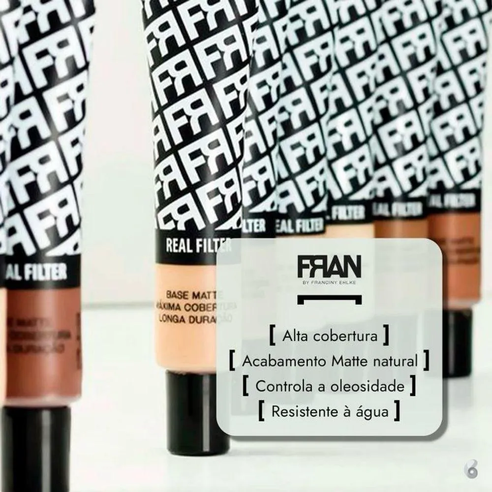 - A Base Matte Fran by Franciny Ehlke Real Filter conta com Ácido Hialurônico em sua fórmula, que ajuda a manter o equilíbrio e a hidratação da pele enquanto evita que craquele. Controla a oleosidade e confere um resultado impecável o dia todo.