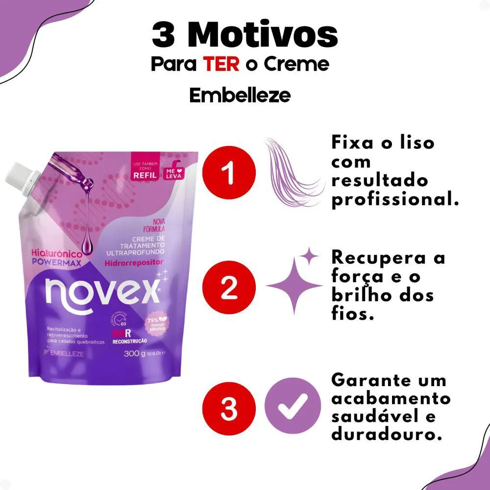 O Refil Creme de Tratamento Novex Hialurônico Powemax Hidrorrepositor 300g da EMBELLEZE é a solução definitiva para quem almeja cabelos profundamente hidratados e revitalizados. Imagine seus fios resgatando o brilho e a maciez perdidos, tudo isso com um tratamento intensivo que age desde a primeira aplicação. Este creme inovador não apenas repõe a hidratação essencial, mas também transforma seus cabelos, proporcionando um toque sedoso e um aspecto visivelmente mais saudável. Ideal para todos os tipos de cabelo, especialmente aqueles que clamam por socorro após processos químicos ou exposição a agentes externos, o Novex Hialurônico Powemax é o segredo para uma hidratação poderosa e duradoura.Benefícios Principais