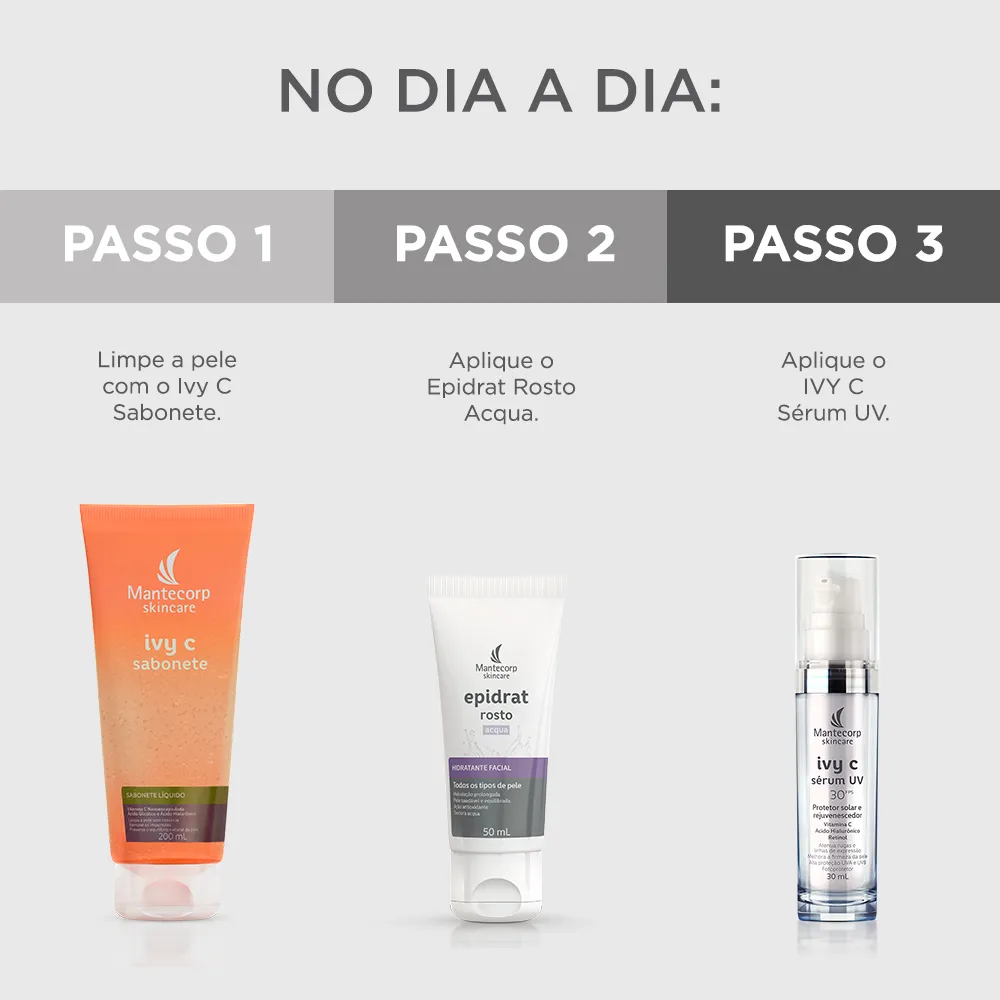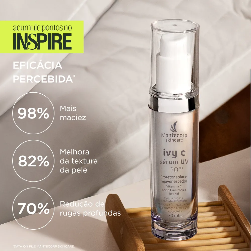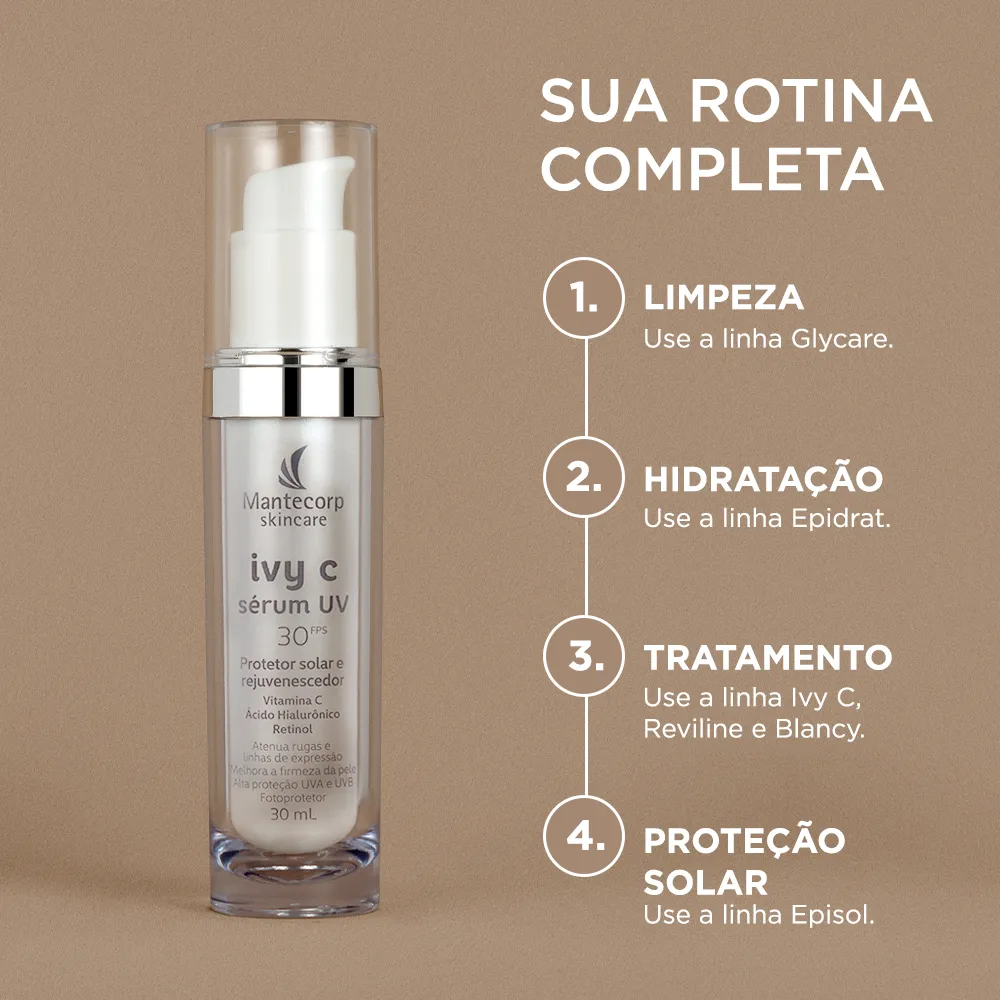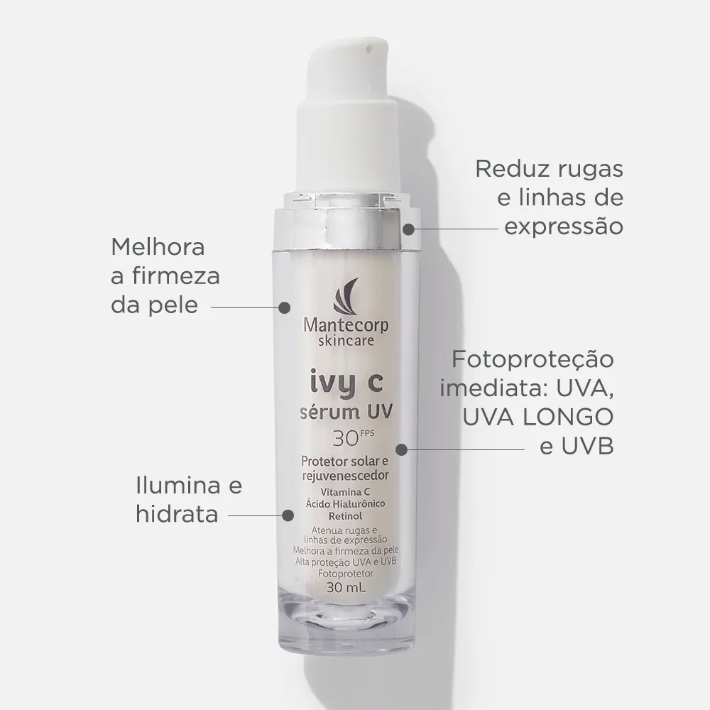 IVY C UV é um sérum rejuvenescedor composto por uma forma de vitamina c nanoencapsulada que garante maior estabilidade e melhor permeação do ativo na pele, intensificando sua ação antioxidante. Ivy C UV também contém Ácido Hialurônico e Nanoesferas de Retinol que em associação combatem os sinais de envelhecimento, reduzindo rugas finas, melhorando a firmeza e textura da pele.Ivy C UV sérum ainda oferece proteção UVA e UVB (FPS 30), sendo prático e ideal para o uso diário, oferendo múltiplos benefícios em um único produto.Pode ser usado no rosto, pescoço e colo.