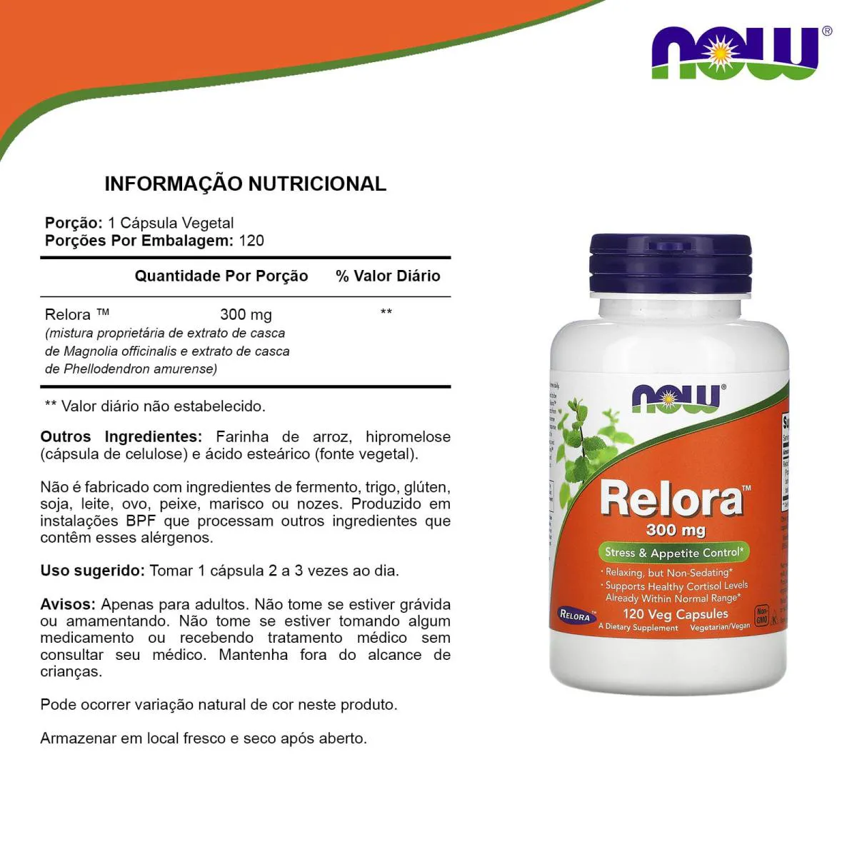 Relora é um suplemento de plantas natural.   Benefícios: Vide informação nutricional.   Sugestão de Consumo: Ingerir 1 cápsula, 2 ou 3 vezes ao dia pela manhã e noite.   **Produto dispensado da obrigatoriedade de Registro conforme a resolução RDC 240/2018 (Anvisa)**