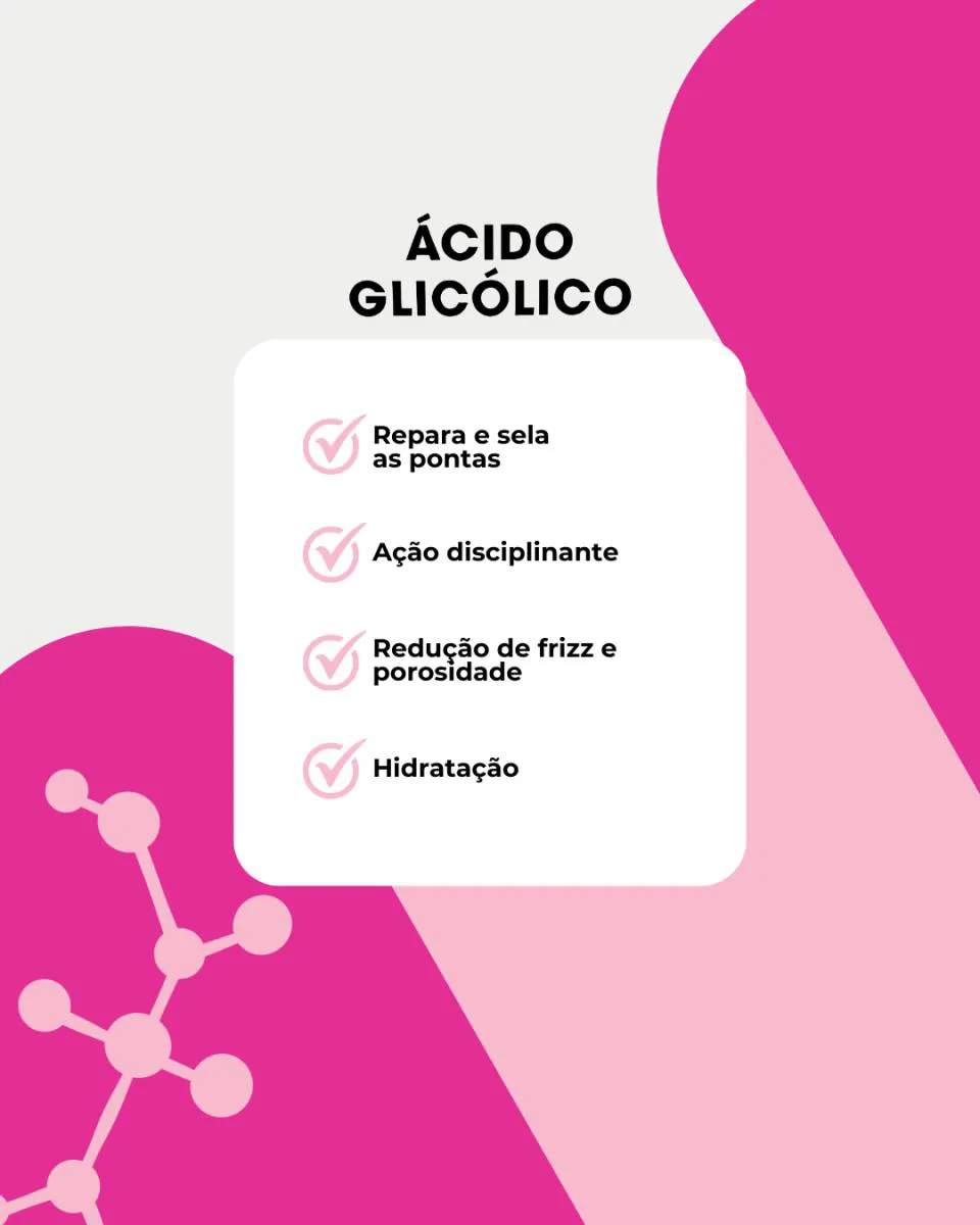 -Ação disciplinante: O ácido glicólico e o D'Pantenol alinham a cutícula do fio, conferindo maciez e sedosidade.