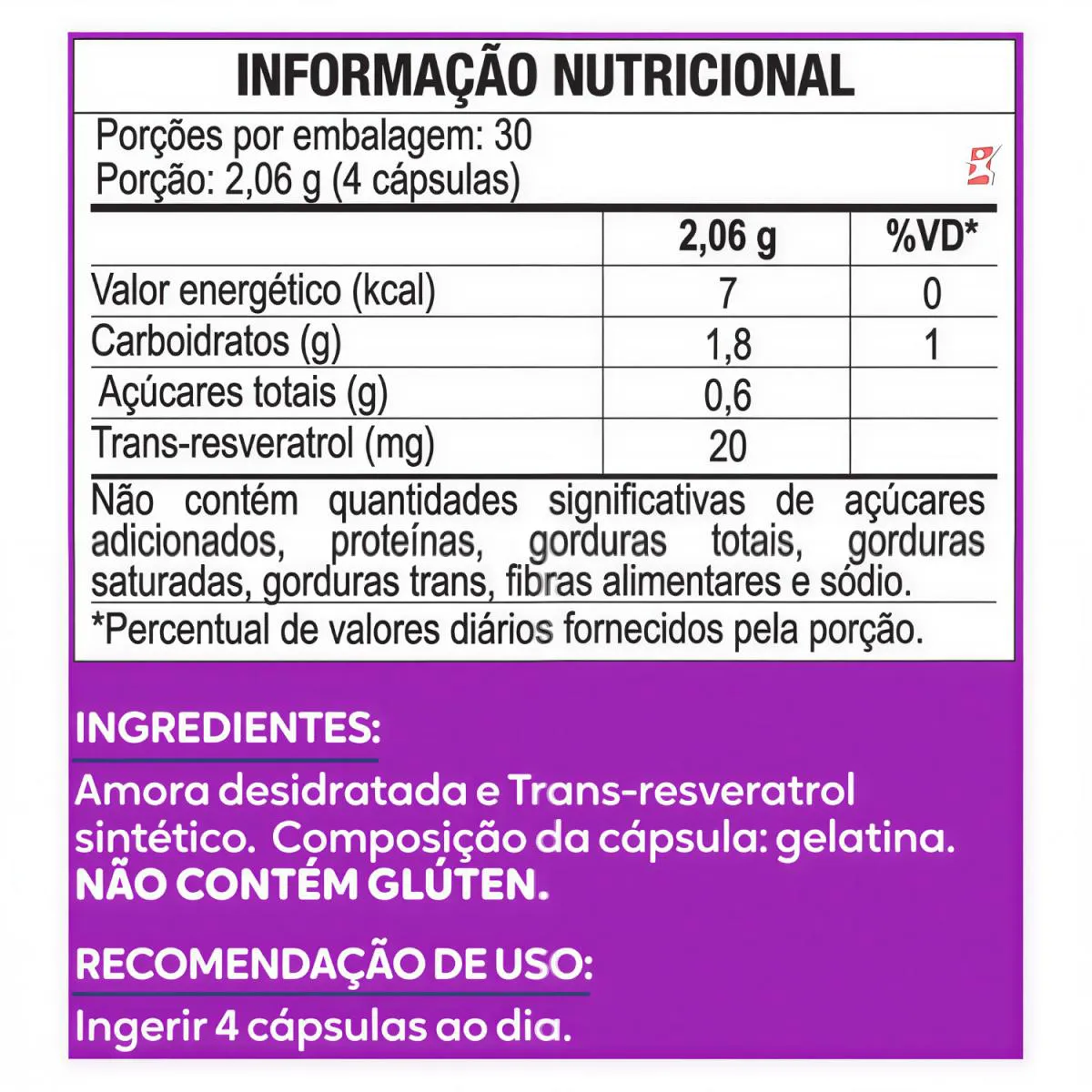 DESCRIÇÃO Este suplemento combina o resveratrol e a amora. Sendo uma opção para quem busca cuidados com a saúde da pele e uma contribuição no alívio dos sintomas da menopausa. O resveratrol é um composto natural encontrado em algumas frutas, como uvas e amoras, e é conhecido por suas propriedades antioxidantes. Ele ajuda a combater os radicais livres no organismo, o que pode contribuir em um envelhecimento mais saudável da pele. O resveratrol tem sido também, associado à promoção da saúde cardiovascular. A amora é uma fruta, rica em compostos como flavonoides e antocianinas. Estes compostos apresentam ação antioxidantes, e podem contribuir no alívio dos sintomas da menopausa. RECOMENDAÇÃO DE USO Ingerir 4 cápsulas ao dia. INGREDIENTES Amora desidratada e Trans-resveratrol sintético. Composição da cápsula: gelatina. NÃO CONTÉM GLÚTEN. SINERGIA DE VITAMINAS E minerais Pode ser associado ao ômega Femme, que apresenta cuidados com a saúde feminina DADOS TECNICOS Resveratrol com amora miura. SUPLEMENTO ALIMENTAR EM CÁSULAS. Contém 120 cápsulas. PRODUTO DESTINADO A PESSOAS ACIMA DE 19 ANOS. ESTE PRODUTO NÃO É UM MEDICAMENTO. NÃO EXECEDER A RECOMENDAÇÃO DIÁRIA DE CONSUMO INDICADA NA EMBALAGEM. MANTENHA FORA DO ALCANCE DE CRIANÇAS. ESTE PRODUTO NÃO DEVE SER CONSUMIDO POR GESTANTES, LACTANTE E CRIANÇAS.