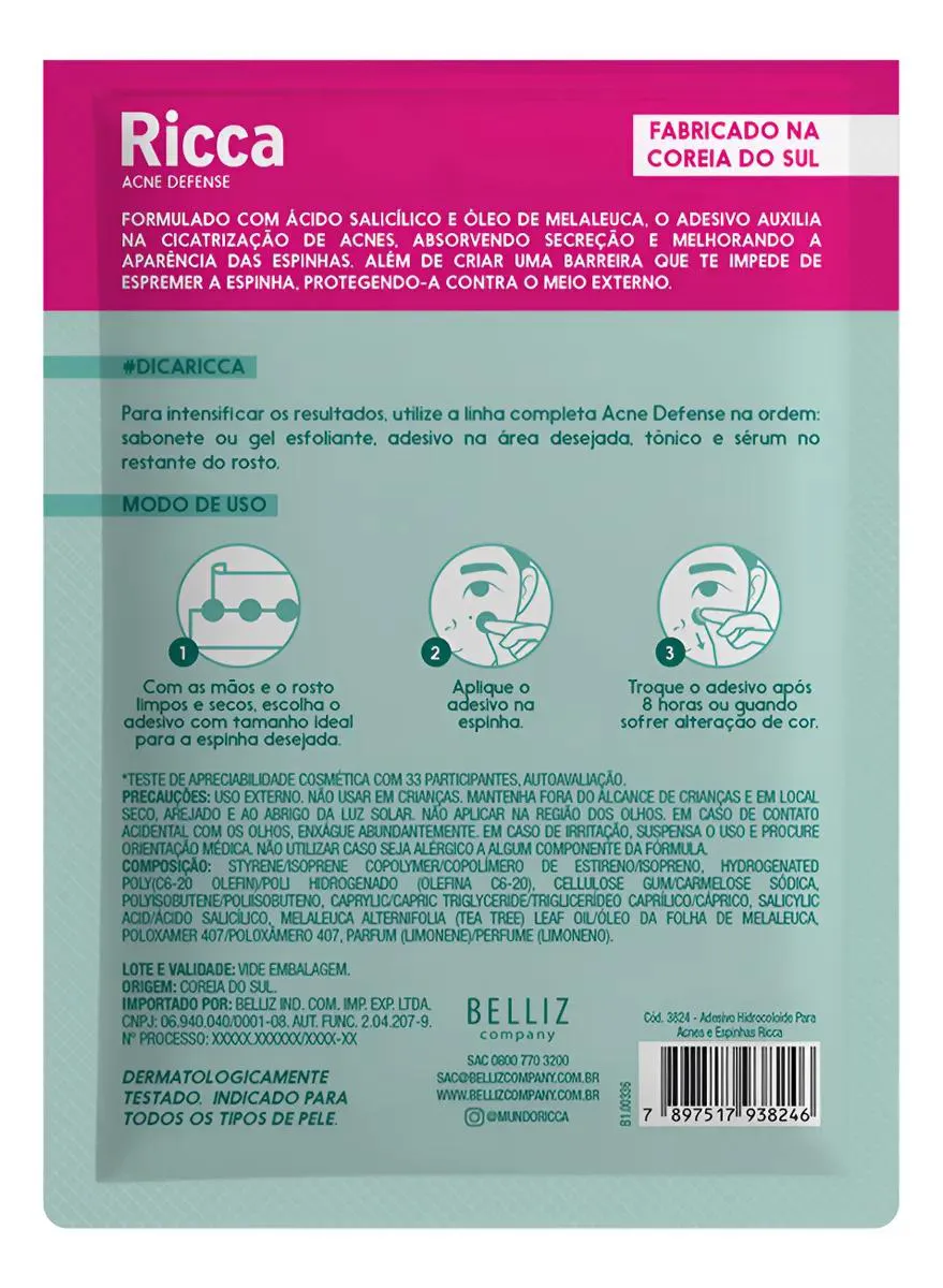 Formulado com ácido salicílico e óleo de melaleuca, o adesivo auxilia na cicatrização de acnes, absorvendo secreção e melhorando a aparência das espinhas, além de criar uma barreira que te impede de espremer a espinha, protegendo-a contra o meio externo.