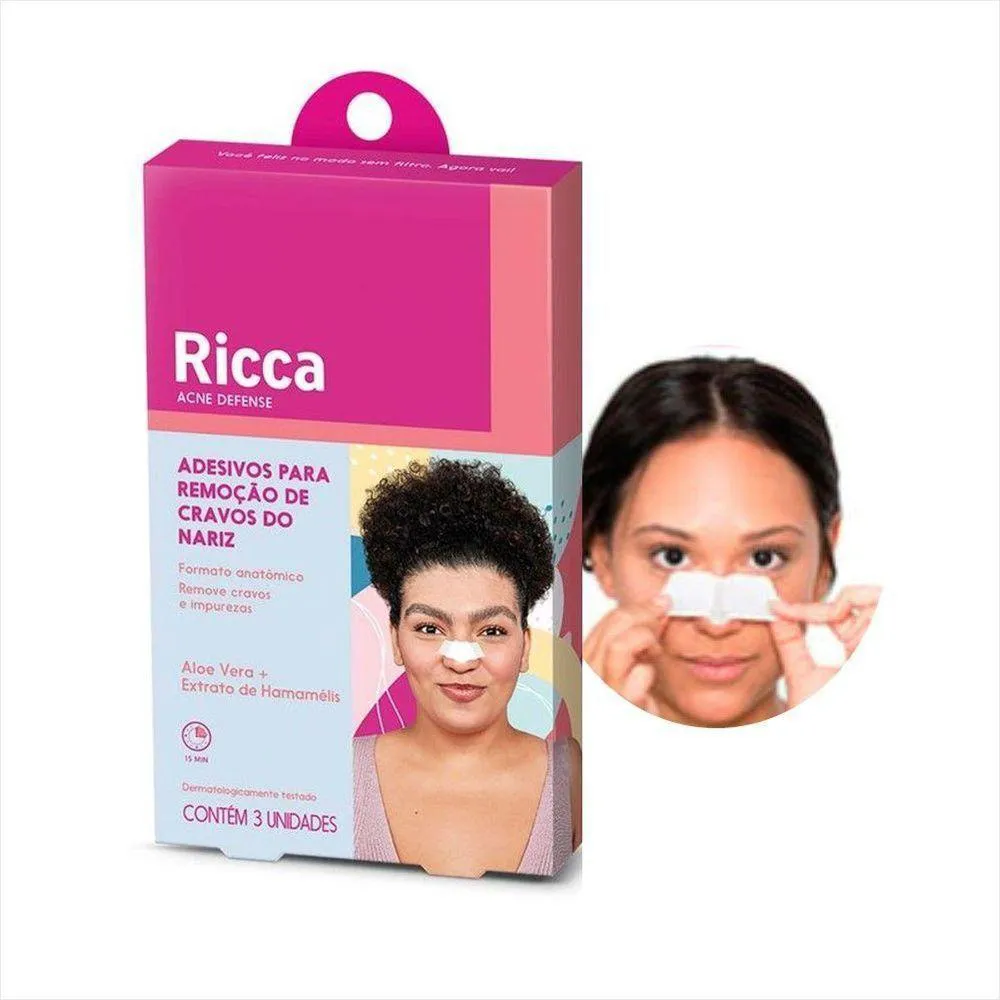 Ricca Adesivo Para Retirar Cravos do Nariz 3pcs: Pele Limpa e Radiante!Descubra o poder transformador do Ricca Adesivo Para Retirar Cravos do Nariz 3pcs! Este produto inovador oferece uma solução prática e eficaz para a remoção de cravos, proporcionando uma pele limpa e saudável com resultados visíveis desde a primeira aplicação. Diga adeus aos cravos e olá à luminosidade!Introdução:Os adesivos faciais Ricca são a solução que você esperava para resolver o dos cravos, especialmente na área do nariz. Cada pacote contém três adesivos projetados para aderir firmemente à pele, removendo impurezas e deixando seu rosto revitalizado. Com uma que combina praticidade e eficácia, esses adesivos são indispensáveis na sua rotina de beleza.Ingredientes e Composição:Os adesivos são elaborados com uma moderna que contém ingredientes como carvão ativado e extrato de tea tree. O carvão ativado é conhecido por suas propriedades detoxificantes, enquanto o extrato de tea tree possui propriedades antibacterianas e anti-inflamatórias, ajudando a prevenir o surgimento de novas imperfeições. Juntos, esses componentes garantem uma limpeza profunda e eficaz, sem agredir a pele.Modo de Usar:Para obter os melhores resultados, siga estas etapas simples:Comece lavando bem o rosto e secando a área do nariz.Remova o adesivo da embalagem e aplique-o diretamente sobre a área afetada, pressionando levemente para garantir a aderência.Deixe agir por 10 a 15 minutos ou até que o adesivo esteja completamente seco.Remova o adesivo com cuidado, puxando-o lentamente pelas bordas.Para um toque final, enxágue o rosto com água fria para fechar os poros.Benefícios:Remoção eficaz de cravos em poucos minutos.Pele limpa e livre de impurezas.Proporciona uma sensação refrescante e confortável.Ideal para uso semanal, ajudando na manutenção da pele saudável e bonita.