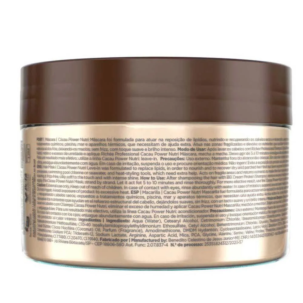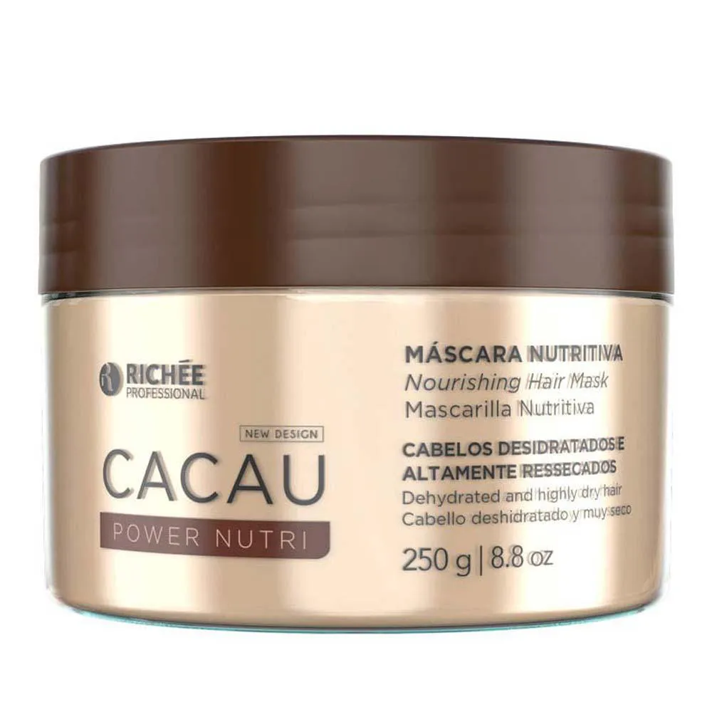 Sobre a linha (Home Care) A linha Cacau Power Nutri foi especialmente elaborada para a nutrição dos cabelos secos e ressecados, expostos à tratamentos químicos, piscina, mar e aparelhos térmicos, que necessitam de ajuda extra. Seus ricos ativos: Manteiga de Cacau, Óleo de Coco, Óleo de Abacate, Óleo de Gergelim, Óleo de Palma, são fontes de ácidos graxos e lipídeos, associados aos Aminoácidos, Colágeno Vegetal, D-Pantenol e Água de Coco Verde, auxiliam no reforço estrutural dos fios, fortalecendo a barreira protetora da fibra capilar. Juntos, os ricos ativos, promovem multibenefícios com resultados de longa duração para os cabelos e auxiliam na prevenção de danos futuros, conferindo, maciez, reparação de pontas duplas, ação antifrizz e brilho intenso.
