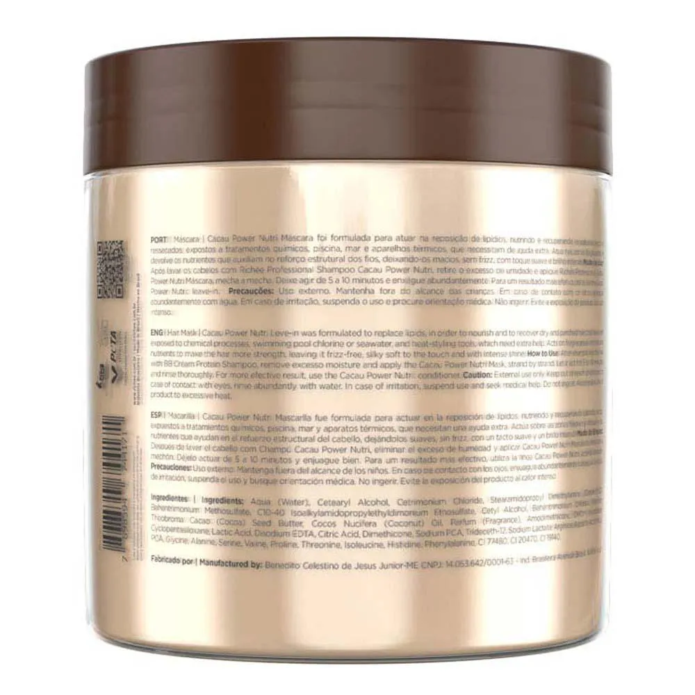 Sobre a linha (Home Care) A linha Cacau Power Nutri foi especialmente elaborada para a nutrição dos cabelos secos e ressecados, expostos à tratamentos químicos, piscina, mar e aparelhos térmicos, que necessitam de ajuda extra. Seus ricos ativos: Manteiga de Cacau, Óleo de Coco, Óleo de Abacate, Óleo de Gergelim, Óleo de Palma, são fontes de ácidos graxos e lipídeos, associados aos Aminoácidos, Colágeno Vegetal, D-Pantenol e Água de Coco Verde, auxiliam no reforço estrutural dos fios, fortalecendo a barreira protetora da fibra capilar. Juntos, os ricos ativos, promovem multibenefícios com resultados de longa duração para os cabelos e auxiliam na prevenção de danos futuros, conferindo, maciez, reparação de pontas duplas, ação antifrizz e brilho intenso.