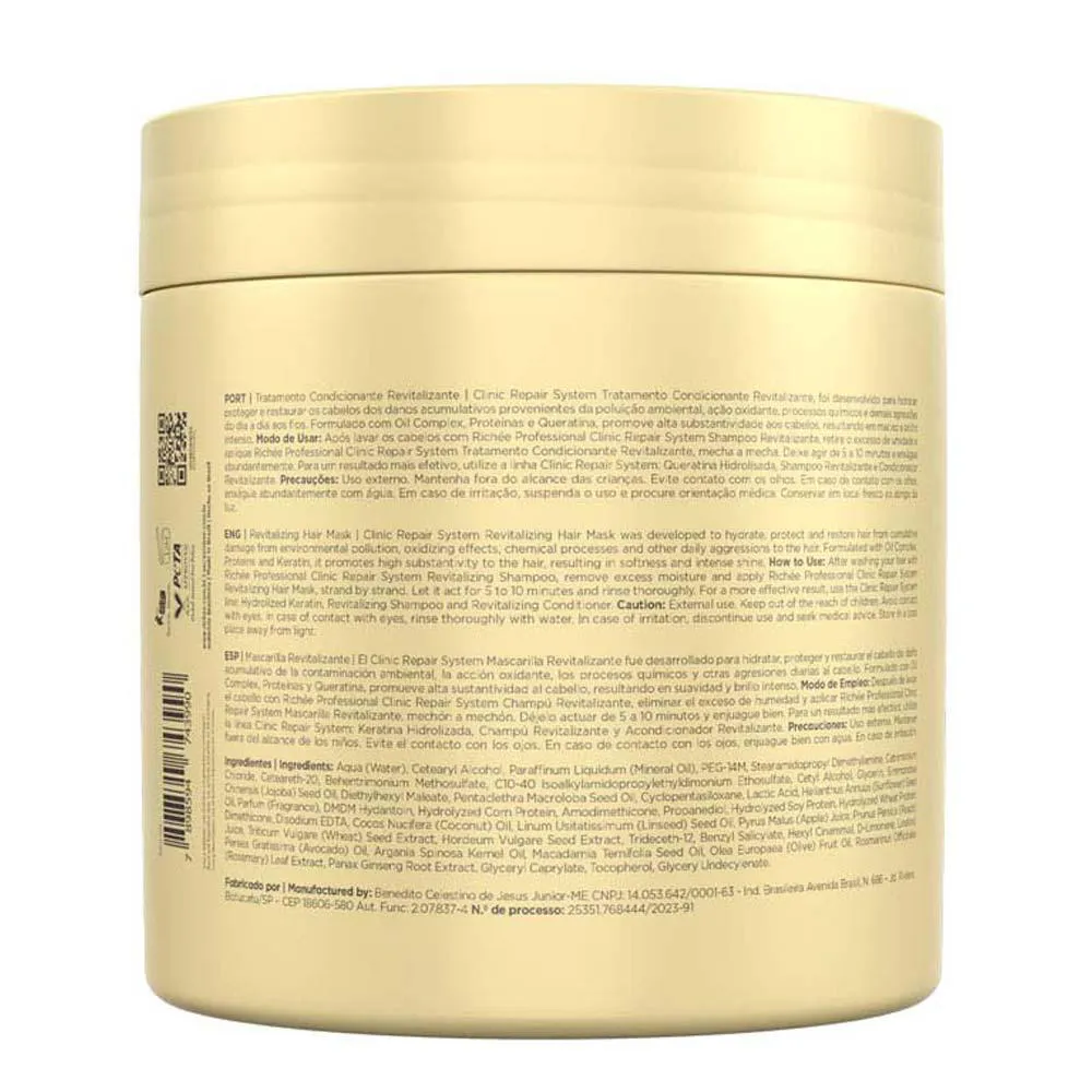 Sobre a linha (USO PROFISSIONAL) A linha Clinic Repair System, oferece em 4 passos o Tratamento Revitalizante Bioavançado, com a ação sinergética dos cereais e multivitaminas, promove força e hidratação profunda, recuperando a fibra capilar, reduzindo os danos causados por tratamentos químicos. Proporciona aspecto saudável aos fios com maciez e brilho. Sobre a marca Ser Richée é estar sempre um passo à frente. Por isso, a prevenção tem sido o forte na elaboração de produtos com qualidade profissional e acessíveis a todos os consumidores.