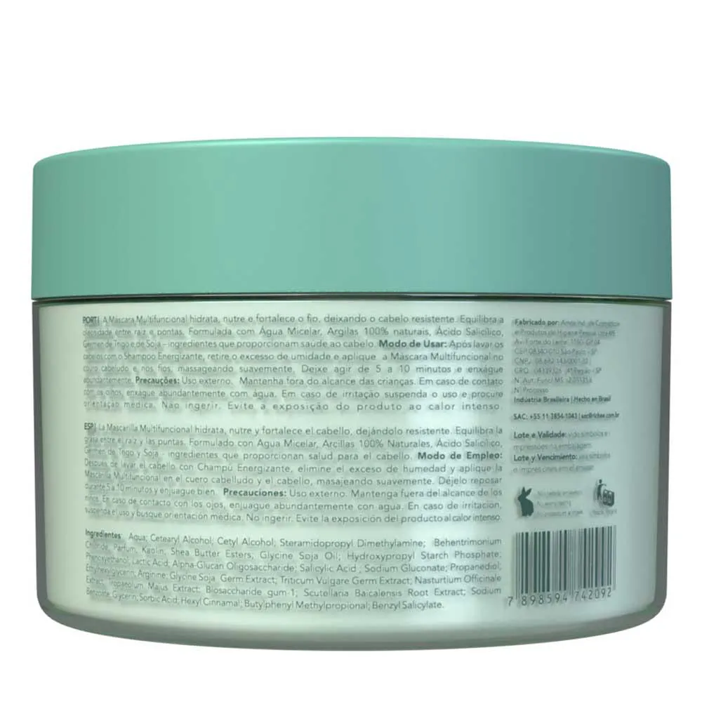 A Máscara Multifuncional hidrata, nutre e fortalece o fio, deixando o cabelo resistente. Equilibra a oleosidade entre raiz e pontas. Formulada com Água Micelar, Argilas 100% naturais, Ácido Salicílico, Gérmen de Trigo e de soja – ingredientes que proporcionam saúde ao cabelo.