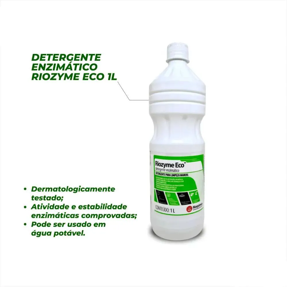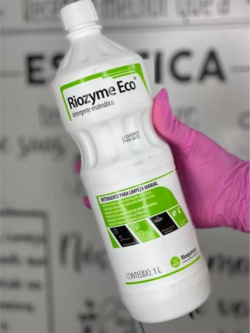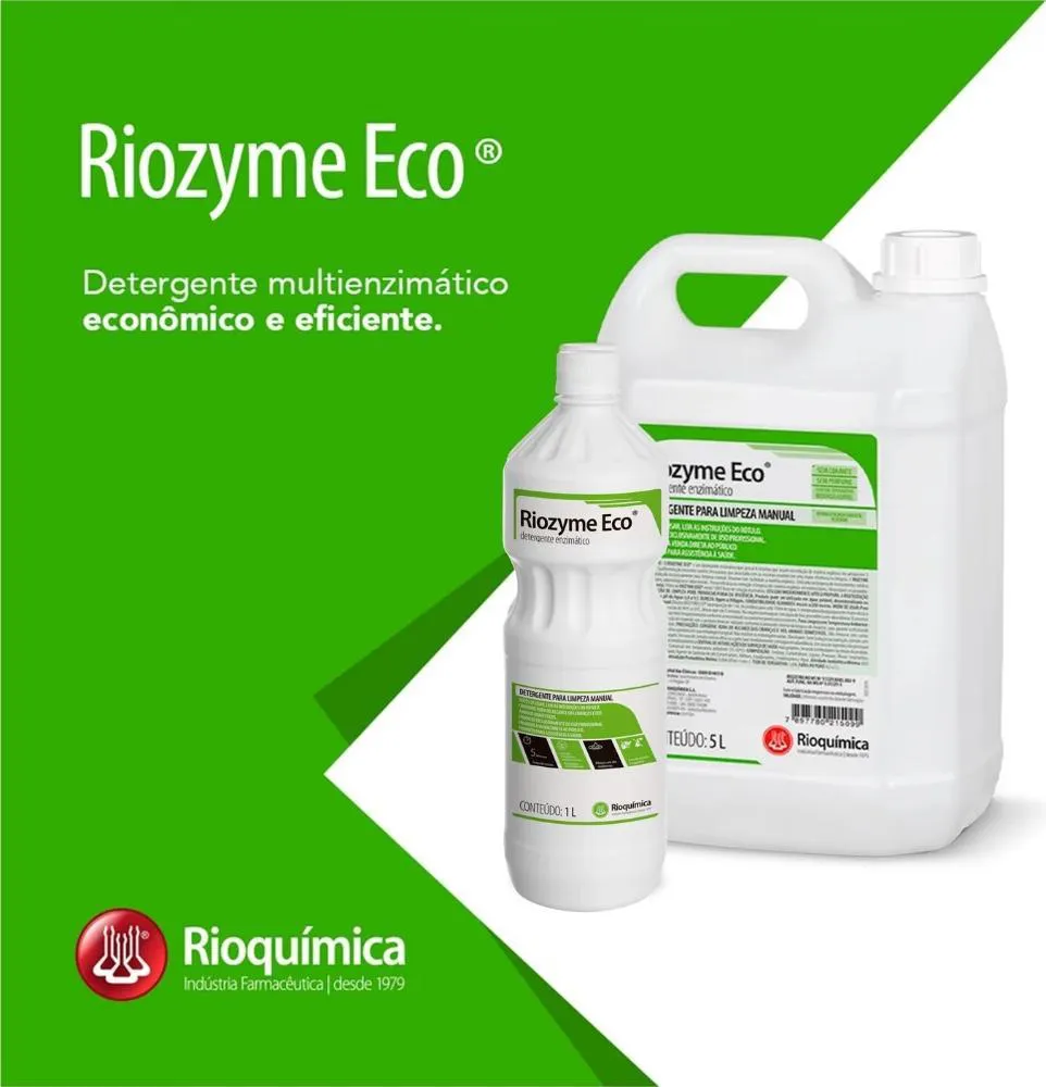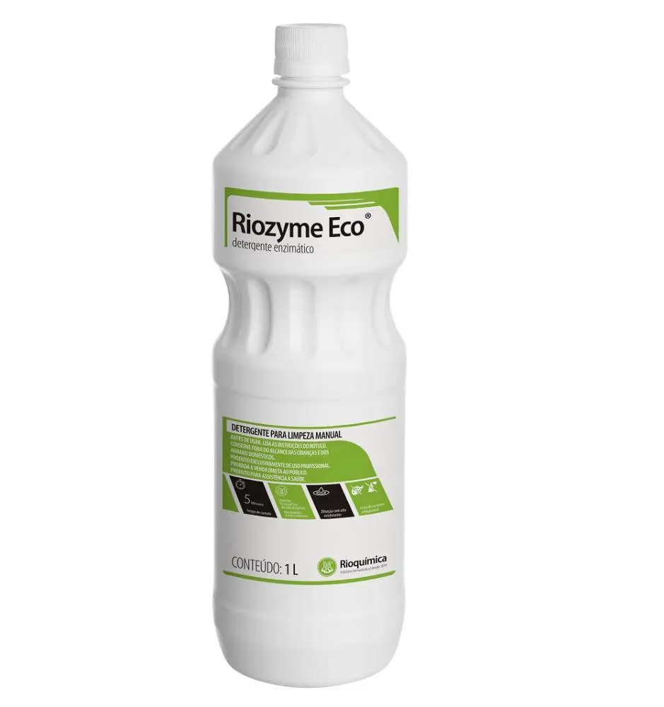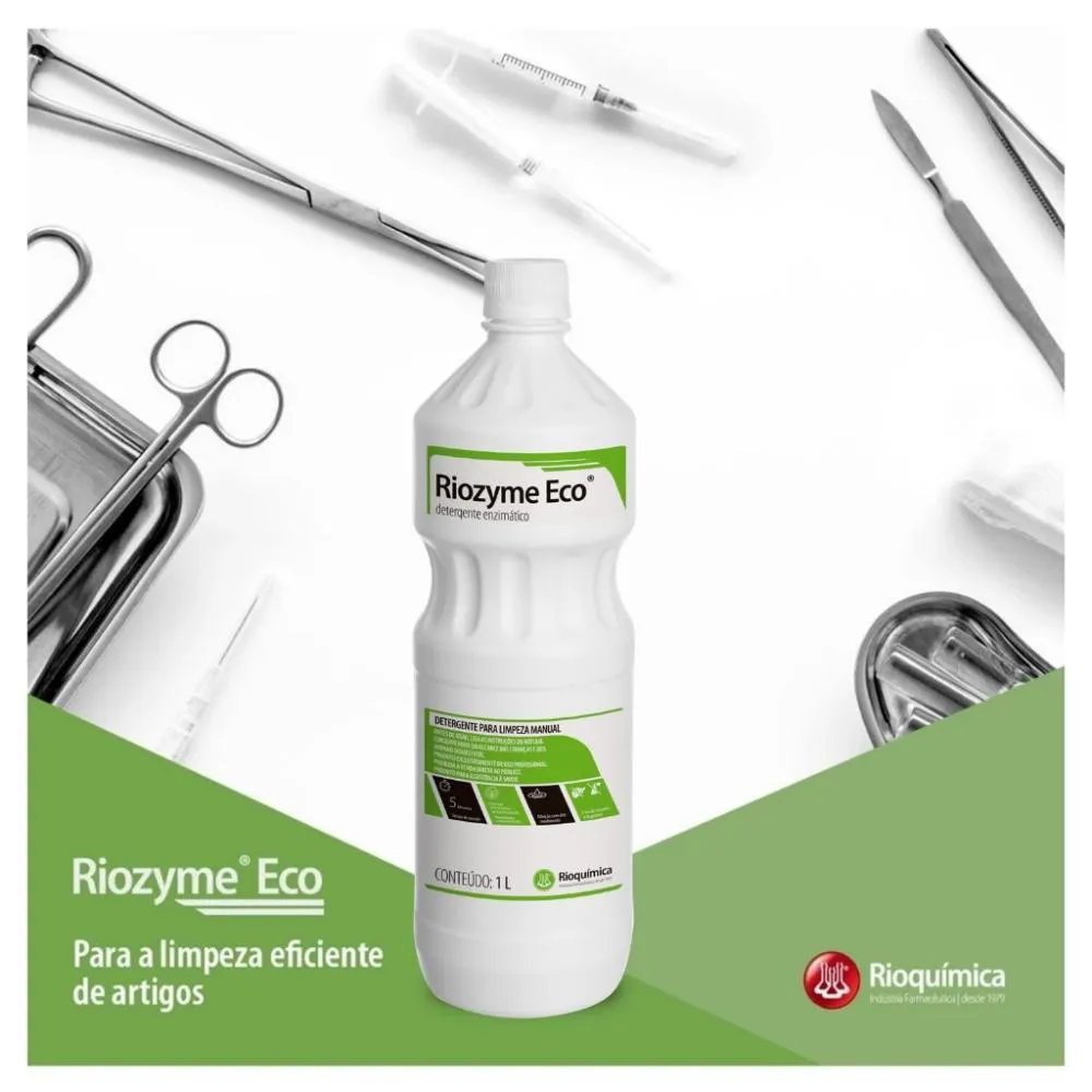 Riozyme Eco - Detergente Enzimático Rioquímica - 1 Litro Descrição:Riozyme Eco Rioquímica é um detergente enzimático de uso profissional desenvolvido para a limpeza manual de instrumentos médico-hospitalares, odontológicos e laboratoriais. Sua fórmula avançada combina quatro enzimas com tensoativos biodegradáveis, proporcionando alta eficácia na remoção de matéria orgânica em apenas cinco minutos. O produto é isento de corantes e fragrâncias, é dermatologicamente testado e 100% biodegradável, respeitando tanto a saúde do usuário quanto o meio ambiente.Modelos disponíveis:Frasco de 1 litro. Benefícios:Alta eficiência na remoção de cargas orgânicas em apenas 5 minutos