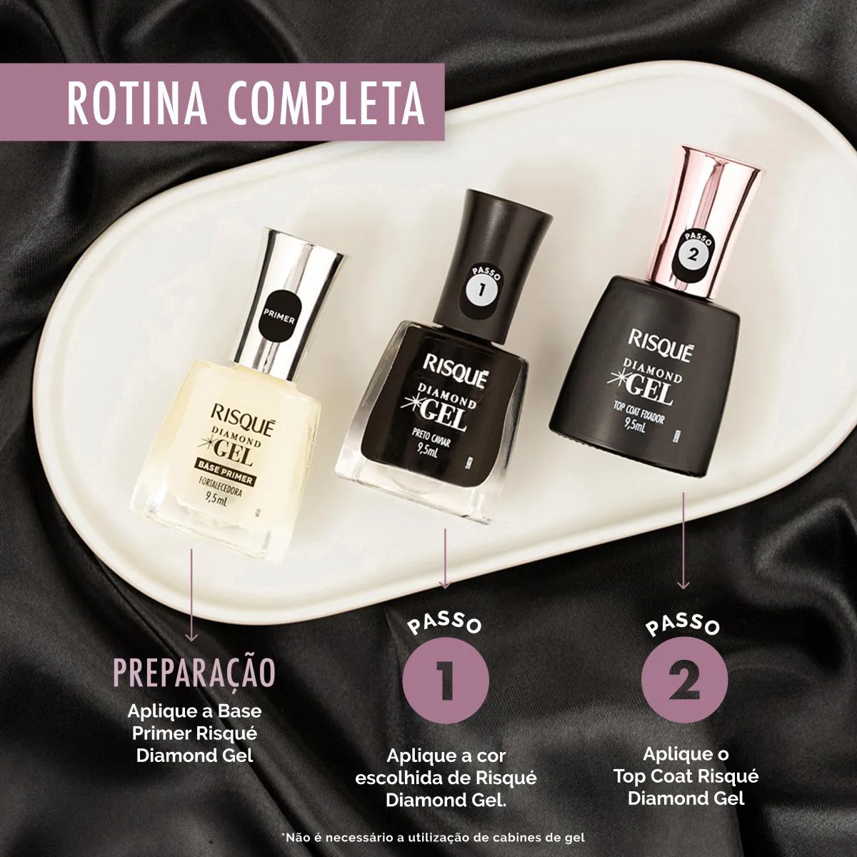 - Finalize com o Top Coat Risqué Diamond Gel para alto brilho e maior durabilidade.