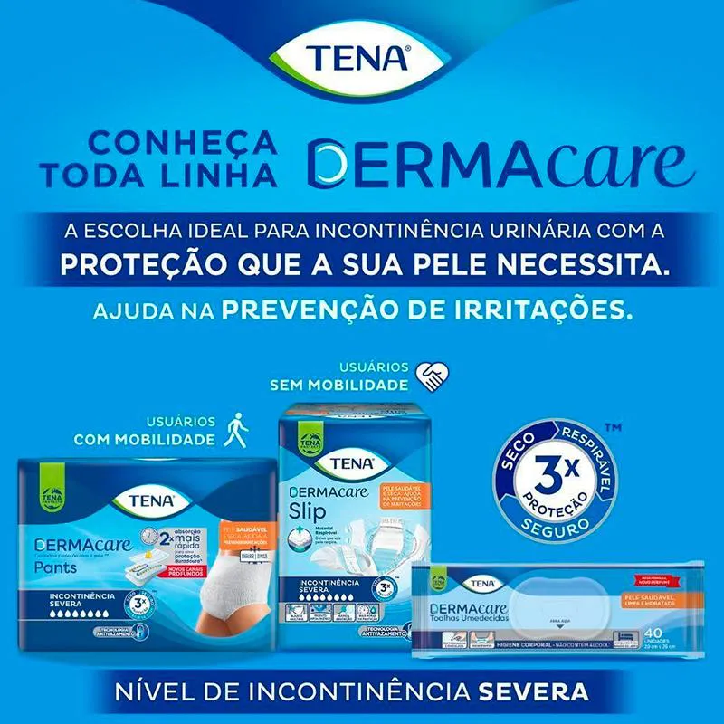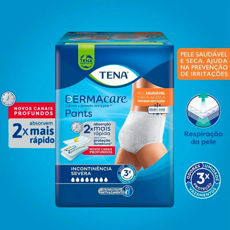 unissex de rápida absorção, que proporciona ao usuário ativo segurança e proteção da pele. A excepcional segurança deve-se à tecnologia antivazamento que absorve rapidamente grandes quantidades de urina mantendo-a longe da pele de forma que, mesmo sentado ou deitado durante muito tempo, o usuário permanece seco e confortável. Reduzindo significativamente o risco de infecções cutâneas. Indicado para incontinência severa, possuindo 3x mais proteção para evitar vazamentos. Um produto hipoalergênico com tecido respirável e macio que ajuda na prevenção de irritações, permitindo que a pele esteja sempre saudável e seca. Possui mais elásticos o que permite um melhor ajuste ao corpo. As roupas íntimas Tena Dermacare são projetadas para minimizar o odor desagradável, mantendo uma sensação de frescor e higiene. Proteção e cuidado para a pele todos os dias. Para usuários com mobilidade. Tamanho: G - EG (70 -110 cm): Referência: 70-110 kg.