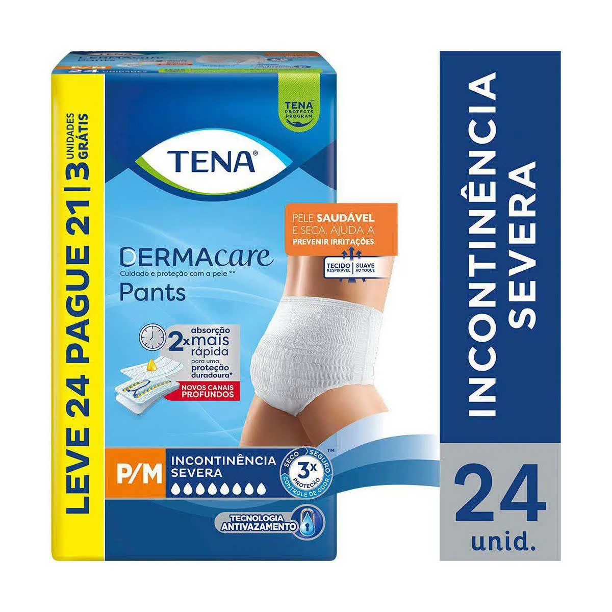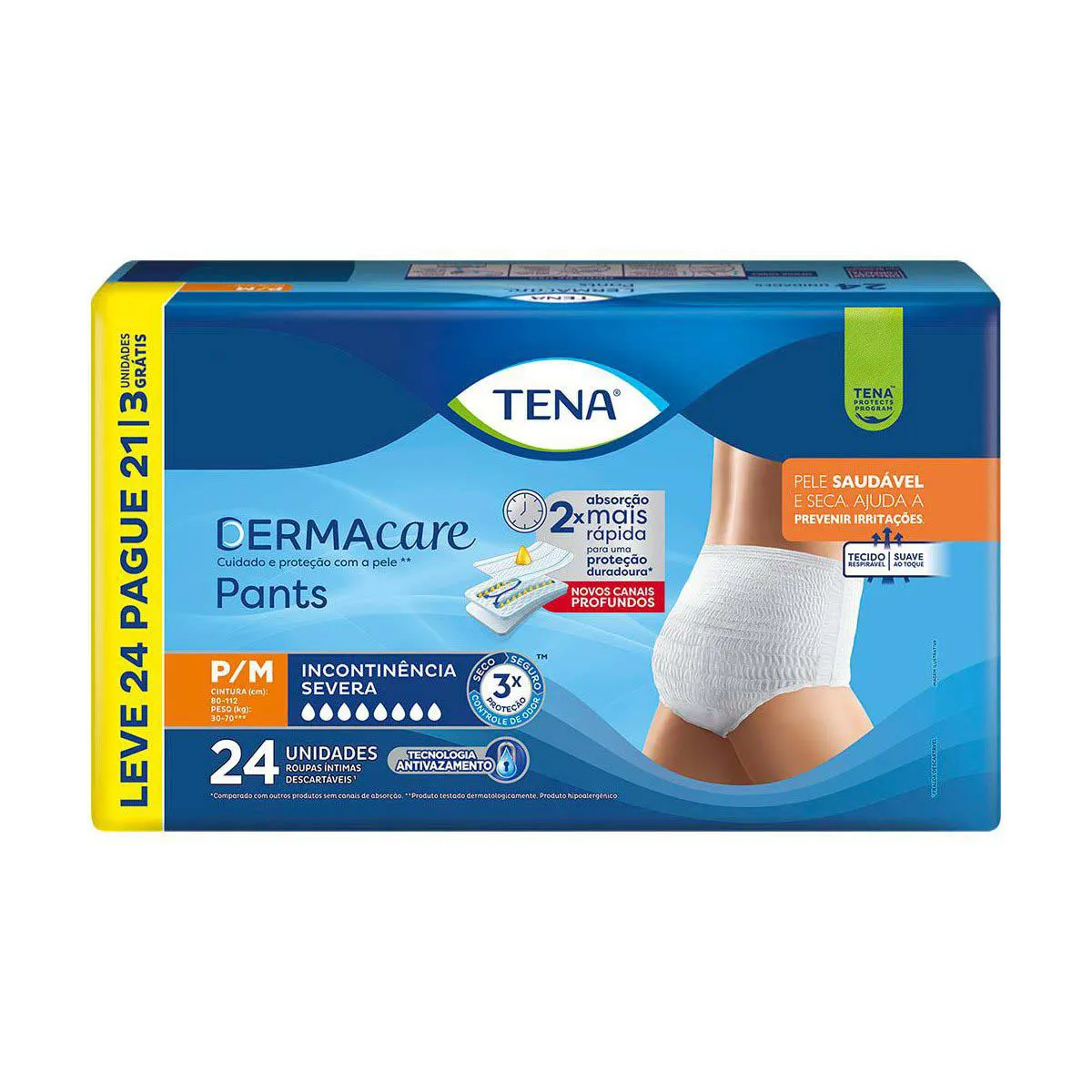 unissex e disponível nos tamanhos, P/M e G/EG, a roupa íntima Tena Pants DermaCare oferece tripla proteção contra vazamentos, mau odores e umidade. Ainda, conta com linhas azuis que indicam qual a parte traseira e formato anatômico com elásticos que se moldam perfeitamente ao corpo, sendo fácil de vestir e tirar.