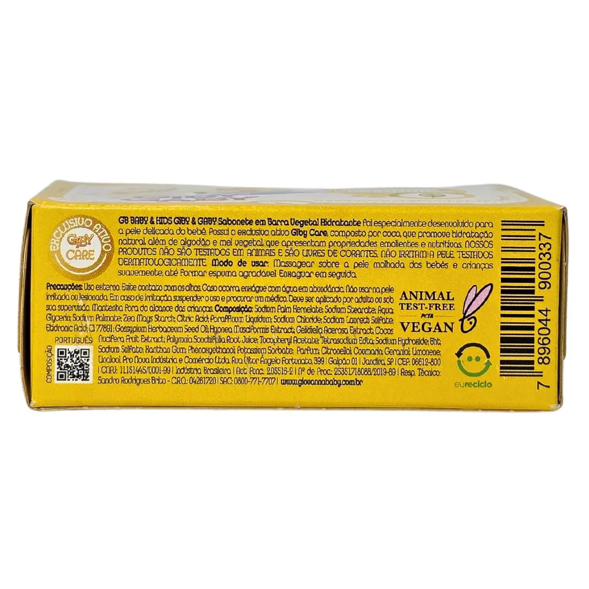 Finalidade: Giby & Gaby sabonete em barra vegetal hidratante foi especialmente desenvolvido para a pele delicada do bebê. Possui o exclusivo ativo Giby Care, composto por coco, que promove hidratação natural, além de algodão e mel vegetal, que apresentam propriedade emolientes e nutritivas. Nossos produtos não são testados em animais e são livres de corantes. Não irritam a pele.