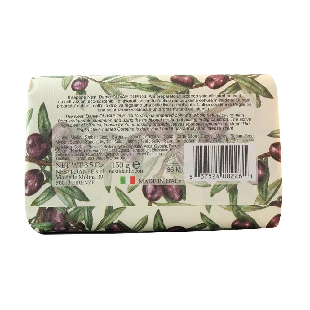 Em reconhecimento a este melhor da produção italiana, Nesti Dante criou o sabonete Olivae Puglia 150g. Olivae di Puglia, é inspirado na azeitona da Puglia chamada de "Coratina", de cor púrpura com um frutado e intenso perfume.