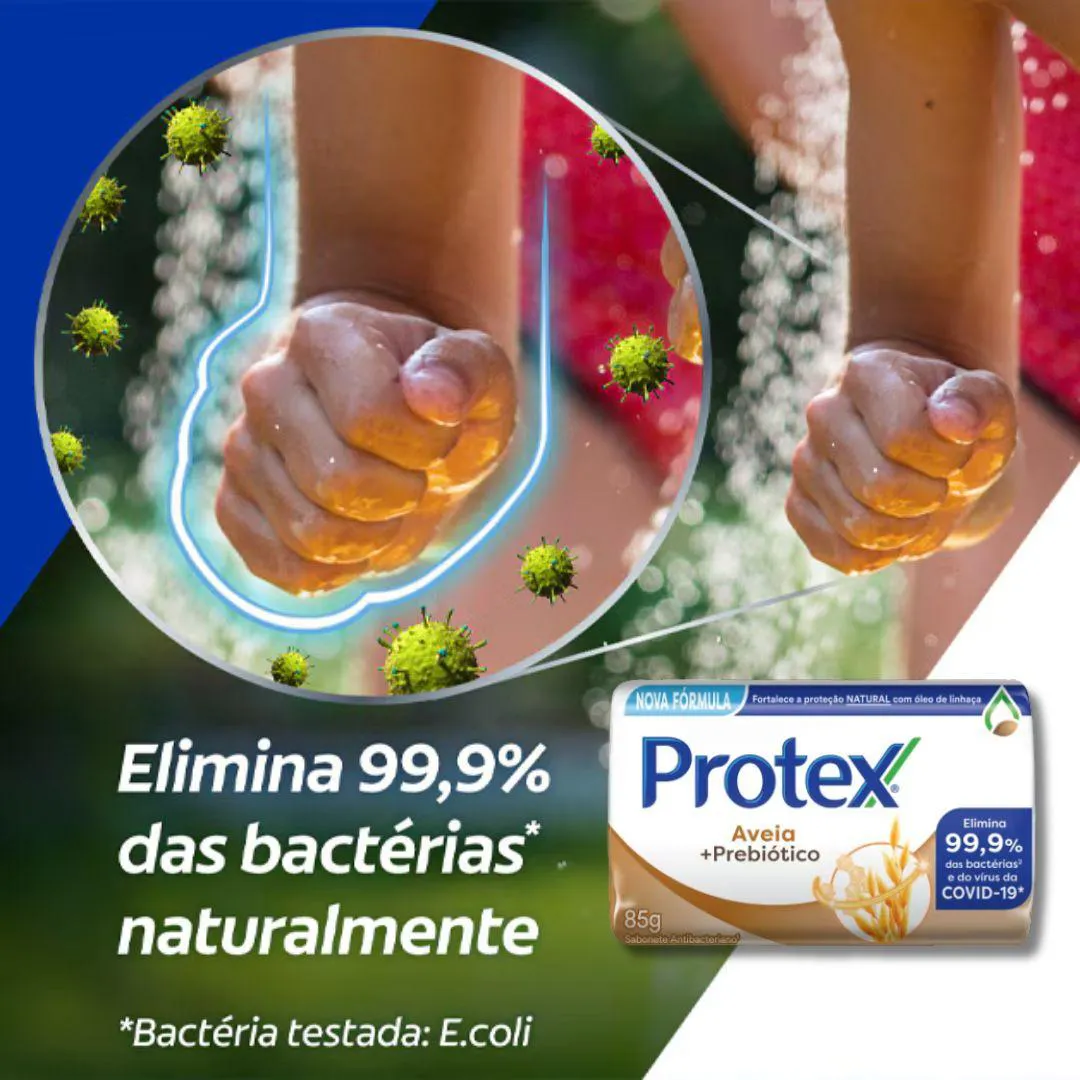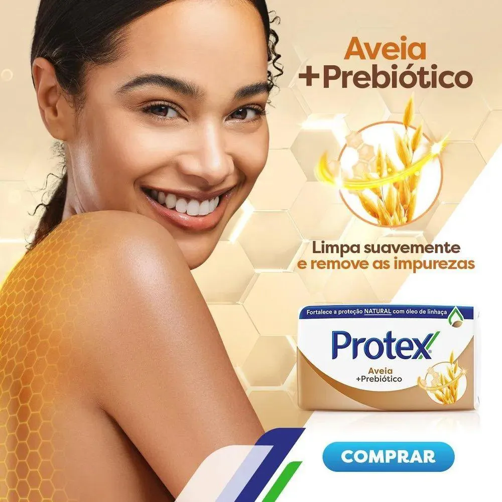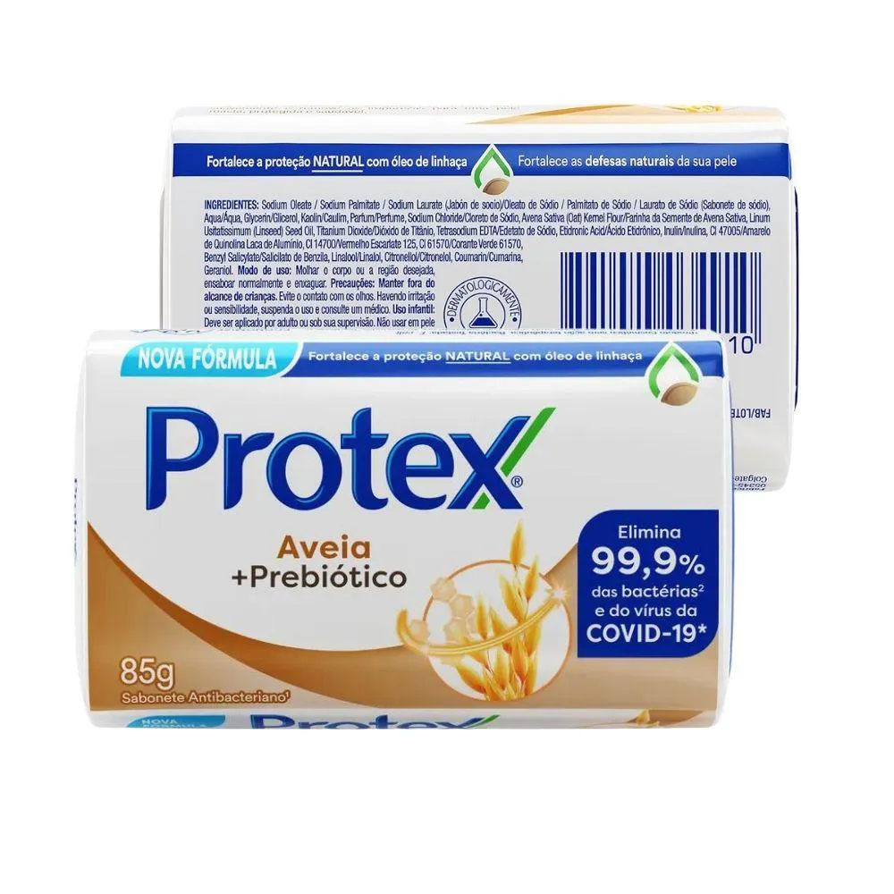 sabonete Protex Aveia + Prebiótico 85g A Protex reinventou os sabonetes antibacterianos, sua fórmula fortalece a proteção natural com óleo de linhaça. Ela é enriquecida com aveia + prebiótico, limpa suavemente e remove as impurezas para a obtenção de uma pele suave, protegida e saudável. Elimina 99,9% das bactérias* e o vírus da COVID-19! Ingredientes ativos: - Oleato de Sódio Palmitato de Sódio Laurato de Sódio (Sabonete de sódio), Aqua Áqua, Glicerol, Caulim, Perfume, Farinha da Semente de Avena Sativa, Óleo da Semente de Linum Usitatissimum, Cloreto de Sódio, Dióxido de Titânio, Edetato de Sódio, Ácido Etidrônico, Inulina, CI 47005 Amarelo de Quinolina Laca de Alumínio, CI 14700 Vermelho Escarlate 125, CI 61570 Corante Verde 61570, Salicilato de Benzila, Linalol, Citronelol, Cumarina, Geraniol Como usar? - Molhe o corpo ou a área desejada, ensaboe normalmente e enxague. Precauções: - Mantenha fora do alcance de crianças. Evite contato com os olhos, se isso acontecer, enxague com bastante água. Se você perceber qualquer reação desfavorável, pare de usar e consulte o seu médico. Este produto pode ser irritante se não for usado como informado nas instruções de uso. Marca: Protex Linha: Aveia + Prebiótico Tipo: Sabonete em barra Peso unitário: 85g Ação: Elimina até 99,9% das bactérias Proteção: Até 12 horas Fórmula: Com óleo de linhaça, aveia e prebiótico Indicação: Corpo pH: Balanceado Dermatologicamente testado: Sim Textura: Espuma cremosa