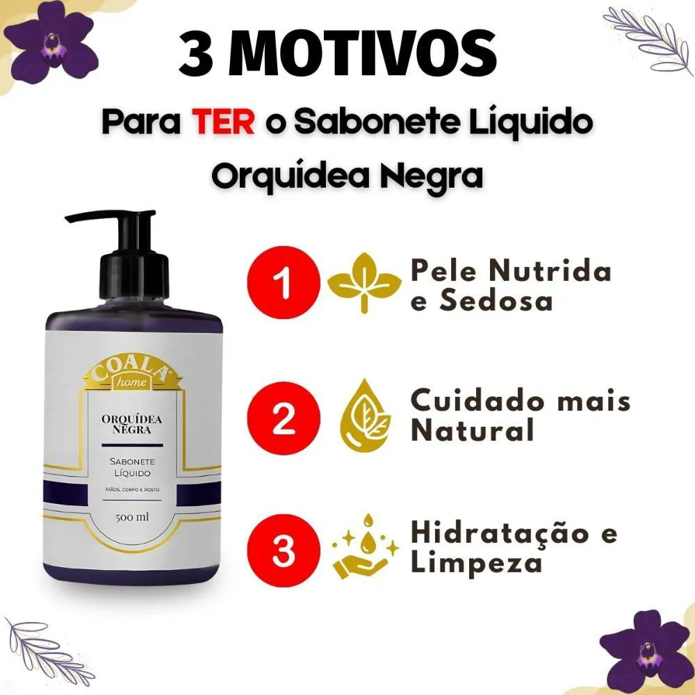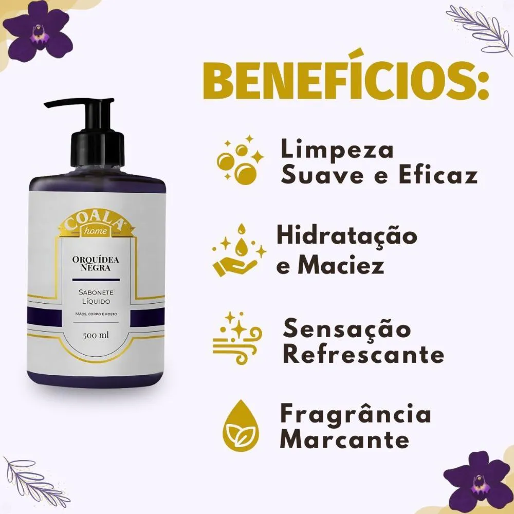 Desfrute de uma experiência de banho e higiene diária elevadas com o Sabonete Líquido Coala Home Orquídea Negra 500ml. Este sabonete líquido foi cuidadosamente desenvolvido para proporcionar uma limpeza suave, porém eficaz, envolvendo seus sentidos com a sofisticada e cativante fragrância de Orquídea Negra. Transforme um simples momento de higiene em um verdadeiro ritual de bem-estar e sofisticação. Ideal para quem busca um produto de higiene e limpeza que alia o mais puro cuidado com a pele a um aroma marcante e duradouro.Sua fórmula exclusiva, enriquecida com o precioso extrato de orquídea, oferece uma notável sensação de pele macia, hidratada e delicadamente perfumada, tornando-o perfeito para o uso diário nas mãos, no corpo e no rosto. O Sabonete Líquido Coala Home Orquídea Negra não é apenas um produto de limpeza, mas sim a escolha ideal para adicionar um toque de elegância, frescor e bem-estar revigorante ao seu dia a dia.Benefícios Principais
