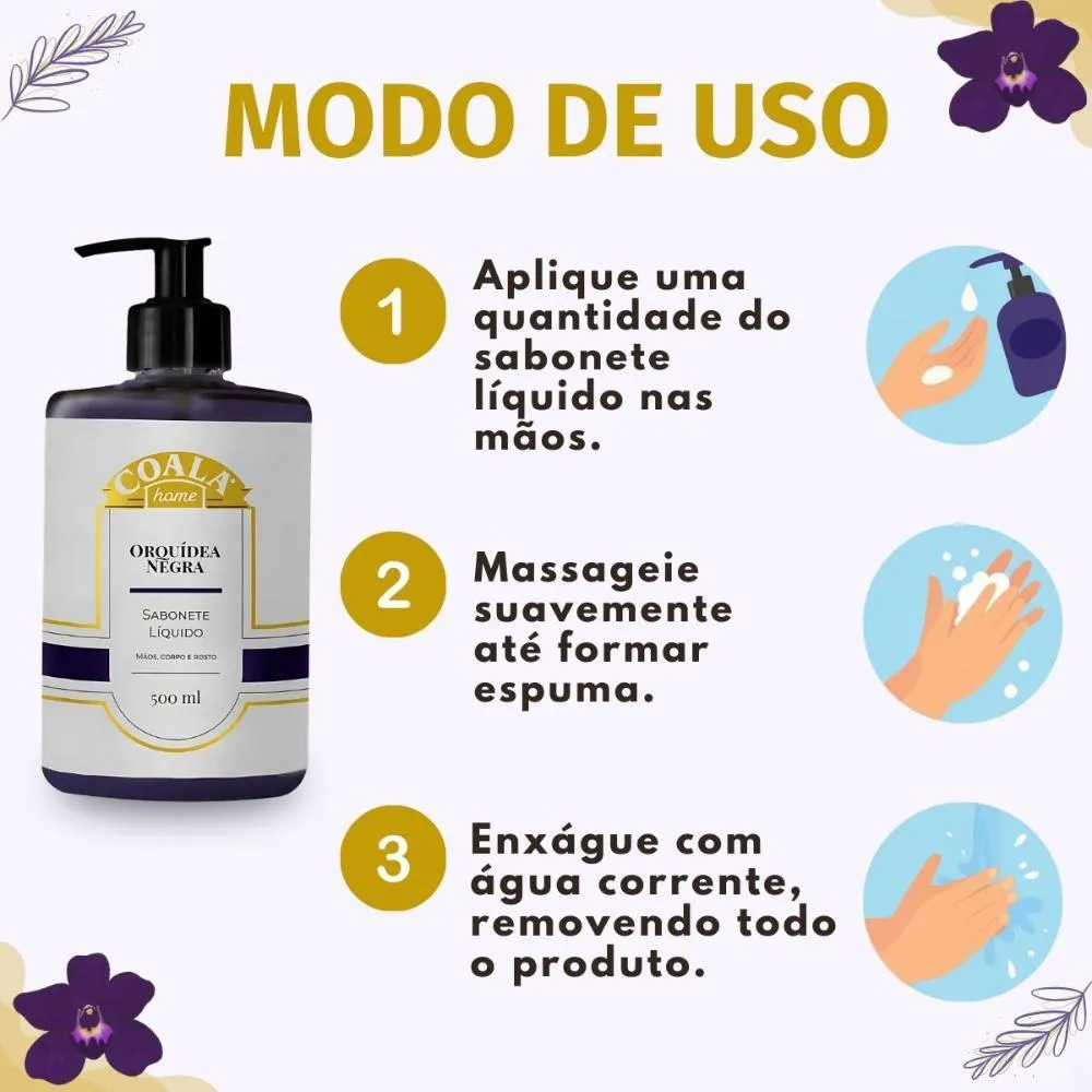 Aplique uma quantidade adequada do Sabonete Líquido Coala Home Orquídea Negra diretamente nas mãos, no corpo ou no rosto.Massageie suavemente com movimentos circulares até formar uma espuma cremosa, rica e abundante.Enxágue completamente com água corrente, removendo todo o produto e deixando a pele limpa, macia e perfumada.Anvisa: 25351.043482/2025-08