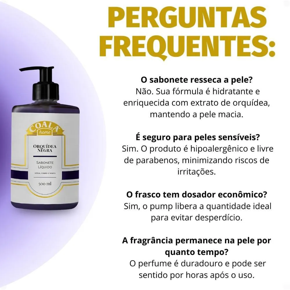 Apresenta uma fragrância exclusiva de Orquídea Negra, cuidadosamente elaborada para conferir um toque de luxo, distinção e sofisticação incomparáveis.É um produto hipoalergênico, o que minimiza significativamente os riscos de alergias, irritações e desconfortos na pele.Sua fórmula é totalmente livre de parabenos, garantindo um cuidado mais natural, seguro e suave para a sua pele, sem comprometer a eficácia da limpeza.É enriquecido com extrato de orquídea, um ingrediente conhecido por suas excepcionais propriedades emolientes, hidratantes e revitalizantes para a pele.Ocasiões de Uso/Cenários Ideais