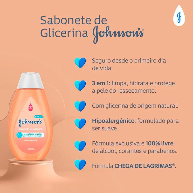 O que é e para que serve:Você sabia que a pele do bebê é mais fina e perde água até duas vezes mais rápido que a pele de um adulto? Por isso, é essencial manter uma rotina de limpeza e hidratação suave desde os primeiros dias de vida. O Sabonete Líquido Glicerina Da Cabeça Aos Pés JOHNSON’S® Baby 400ml oferece o cuidado completo que o seu bebê precisa — 3 em 1: limpa, hidrata e protege a pele contra o ressecamento.