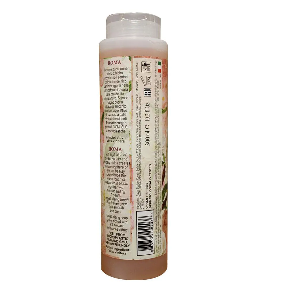 sabonete Líquido Dolce Vivere Roma (Oleandro em Flor, Uvas Moscatel e Figo). As notas açucaradas das Uvas Moscatel encontram os aromas doces do figo para mergulhar na atmosfera de beleza eterna das flores de Oleandro. Sabonete Líquido hidratante para banho, enriquecido com o princípio ativo da uva vermelha com virtudes antioxidantes.