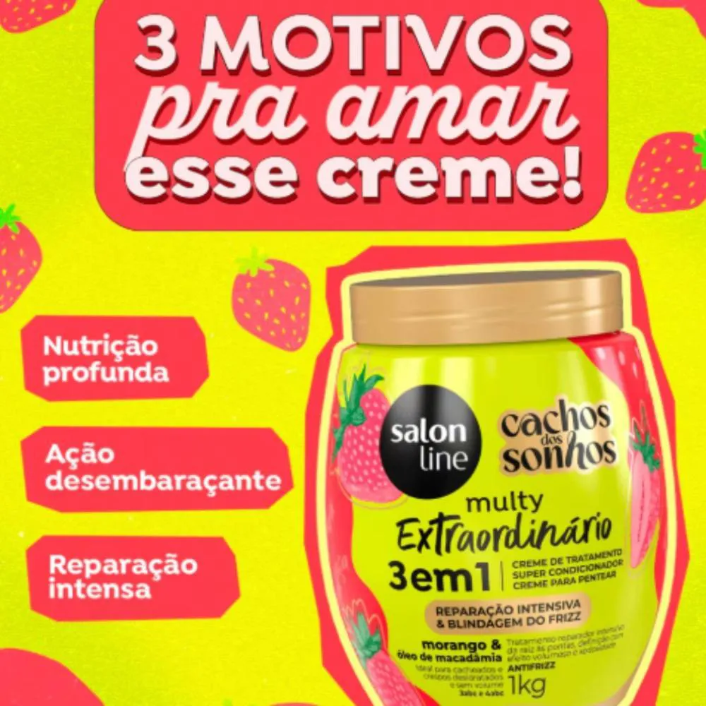 Indicação O Creme de Tratamento Cachos dos Sonhos Multy Extraordinário Morango e Óleo de Macadâmia 1kg da Salon Line é perfeito para cabelos cacheados, crespos, ondulados e em transição. Um produto versátil que atua como creme de tratamento, condicionador e creme para pentear, promovendo nutrição profunda, reparação dos fios e definição com volume natural. Ação- Sua fórmula potente e inteligente é enriquecida com:
