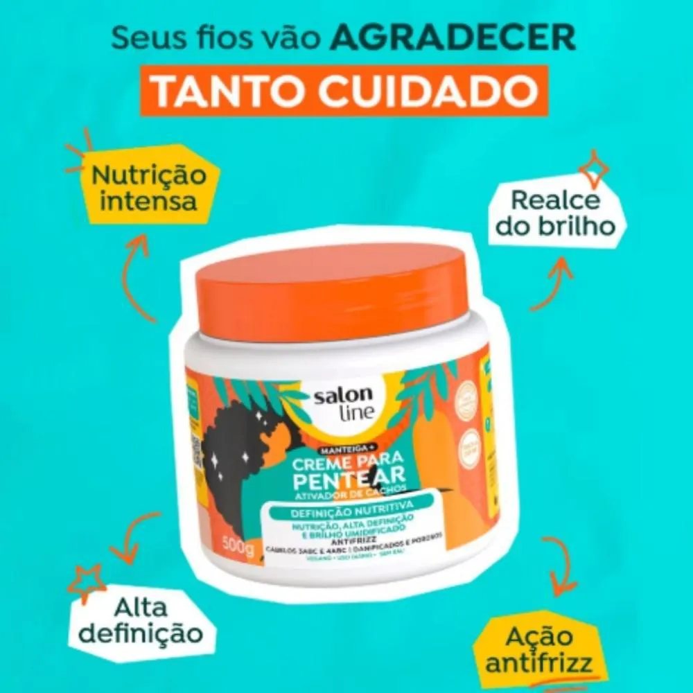 Com efeito condicionante e alta performance, sua fórmula é enriquecida com um poderoso mix de manteiga de karité, manteiga de coco e manteiga de abacate, ativos altamente nutritivos. Eles atuam na fibra capilar, promovendo a reposição de nutrientes, evitando a perda de umidade e garantindo cachos hidratados, definidos e com aquele brilho umidificado que realça a beleza natural dos fios.Conselho de Aplicação