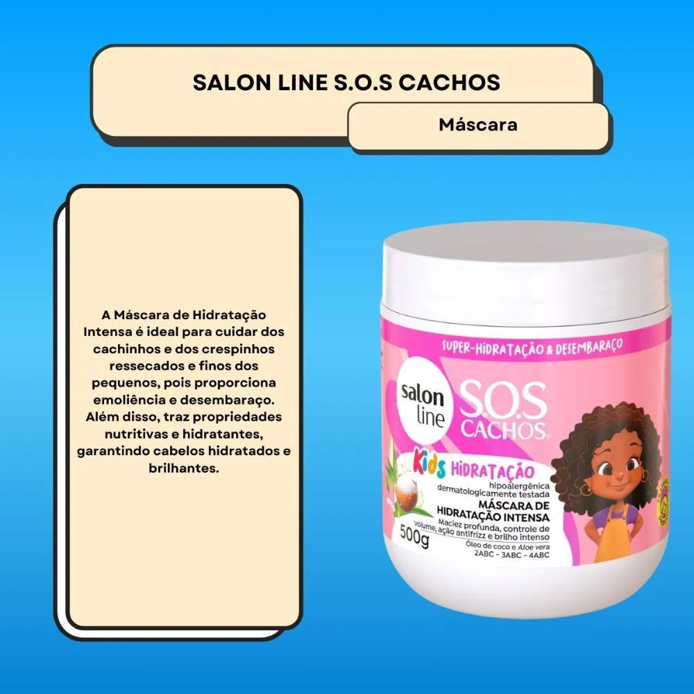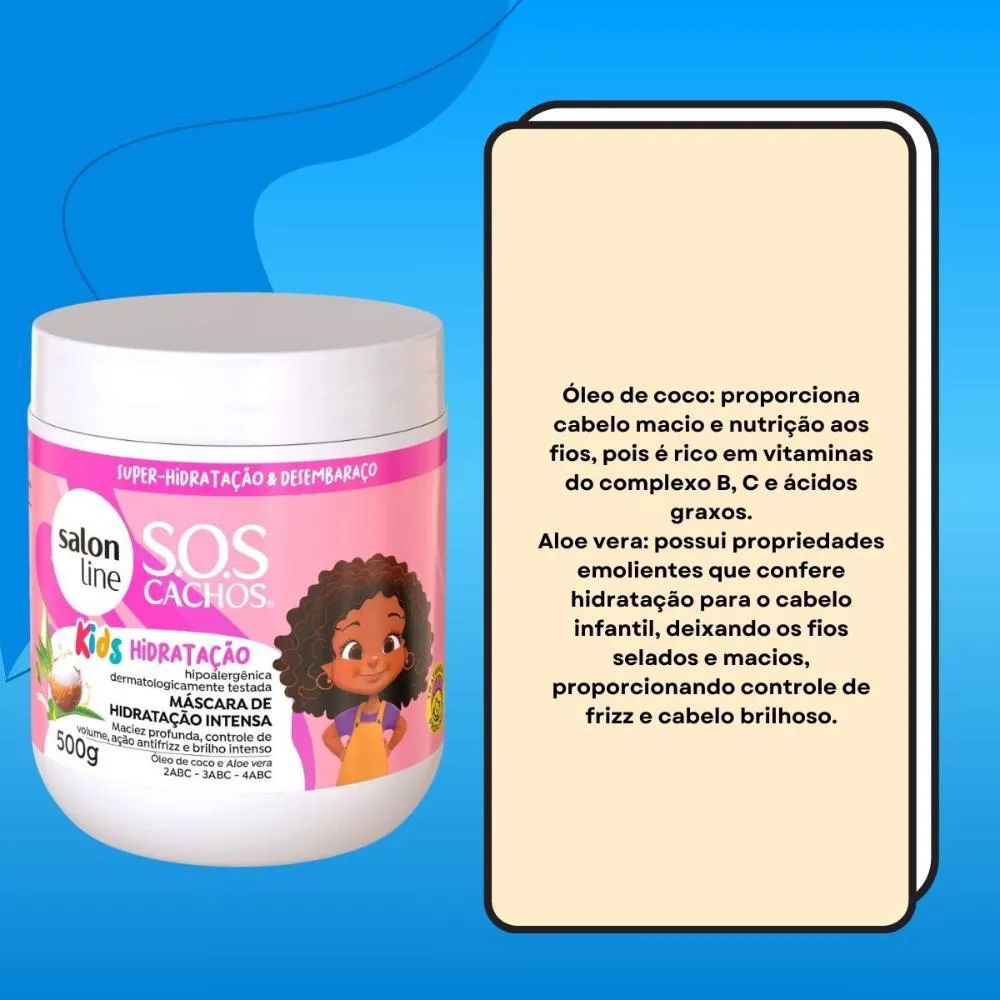 - 01 – Máscara Salon Line SOS Cachos Kids Máscara de Hidratação para Cabelo Cacheado para Cabelo Cacheado 500 gSugestão de uso complementar